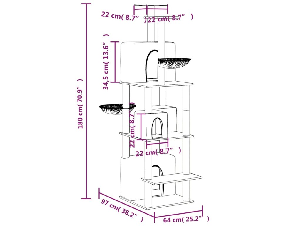- Všestranná věž pro kočky: Víceúrovňový nábytek pro kočky je navržen se 4 domečky, 2 hamakami a plošinami, které poskytují kočkám ideální místo pro šplhání, sezení, škrábání, schovávání se a také k odpočinku.