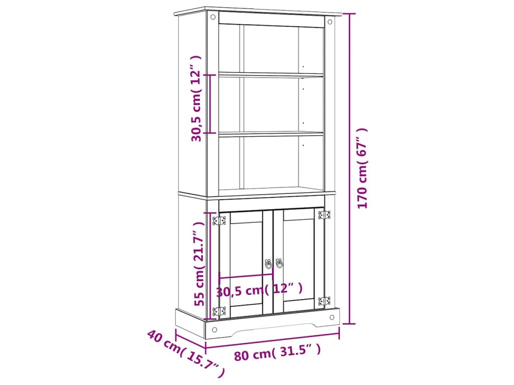 Tato vysoce kvalitní dřevěná skříň je vyrobená v mexickém stylu Corona. Voskované borové dřevo a prvky z černého kovu propůjčují šatní skříni mexický šarm, který dokonale zkompletuje zařízení vaší ložnice, obývacího pokoje nebo salónku. Tuto vysokou skříň můžete používat také jako vitrínu nebo knihovnu.