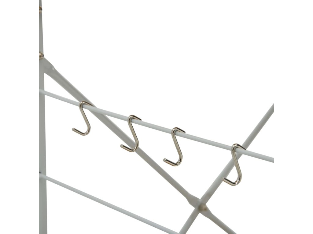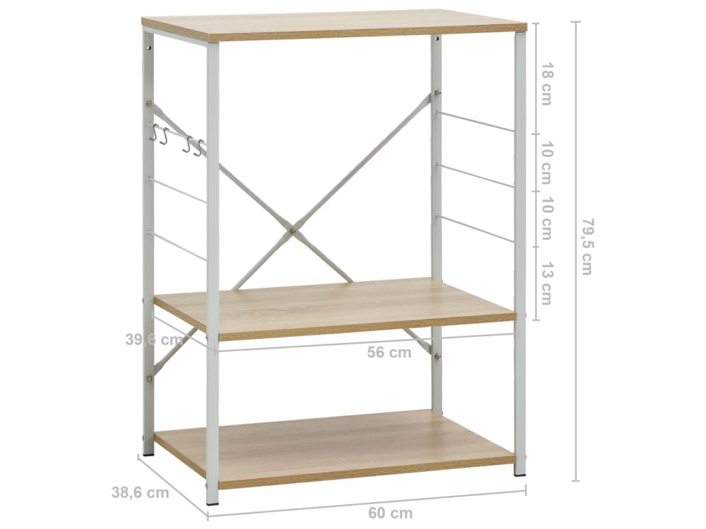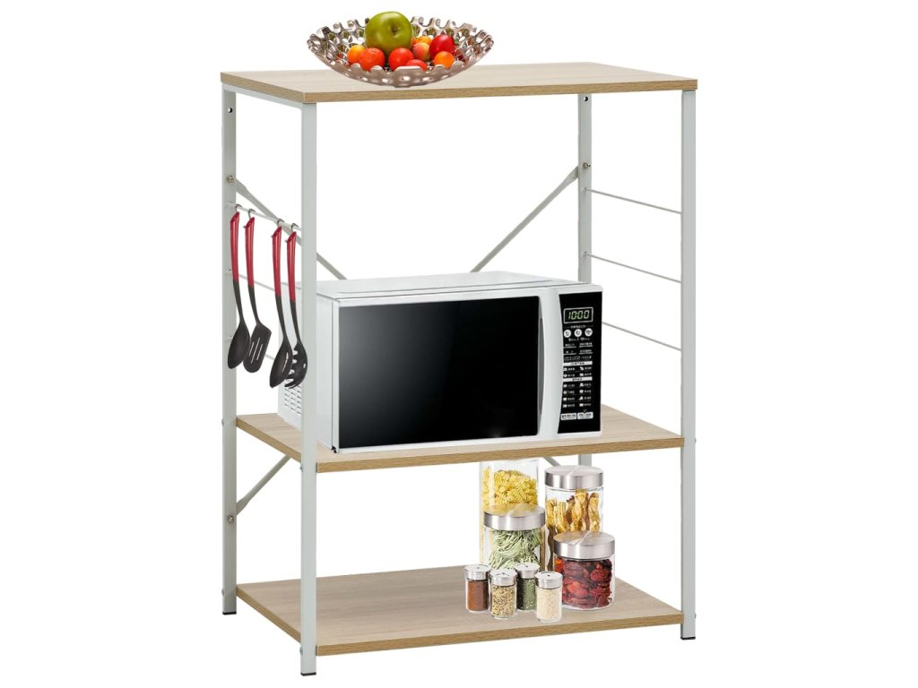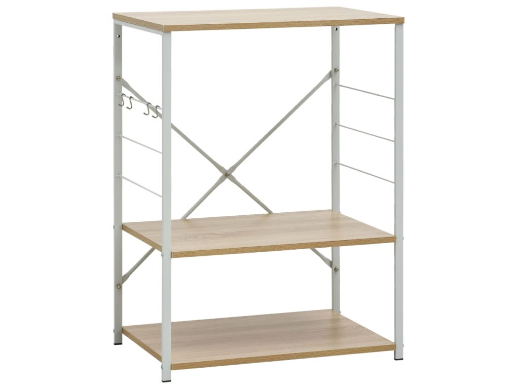 Tato kuchyňská police je zhotovená z kompozitního dřeva, takže se snadno čistí vlhkým hadříkem. Ocelová konstrukce je antikorozní a přispívá k její robustnosti. Tento regál má 3 úrovně, které vám poskytnou dostatek prostoru pro ukládání věcí. Na boku skříňky jsou háčky pro zavěšení hrnců, pánví, nádobí, kuchyňských chňapek a spoustu dalšího. Můžete ji také použít v obývacím pokoji nebo kanceláři k vystavení svých sběratelských předmětů, zarámovaných fotografií atd.
