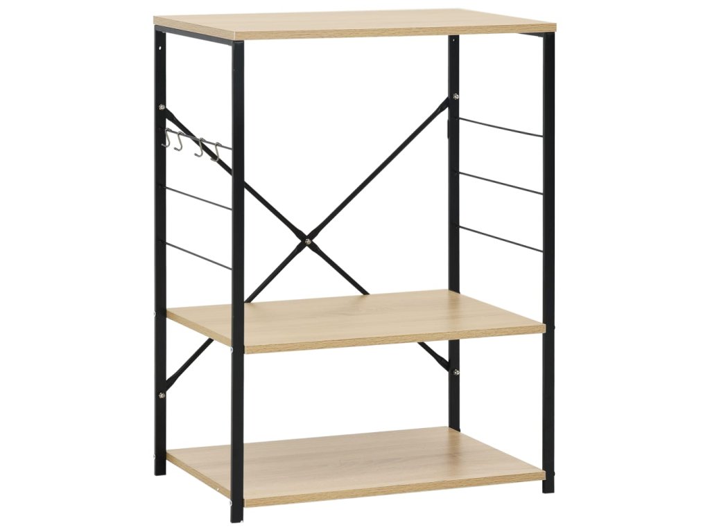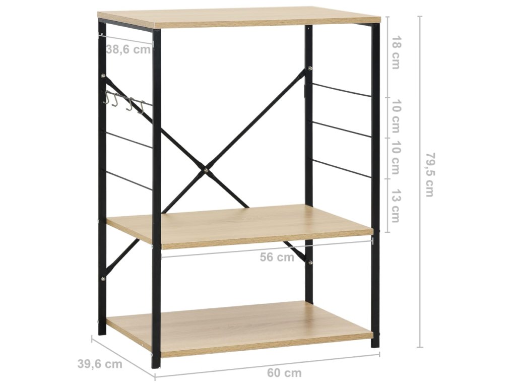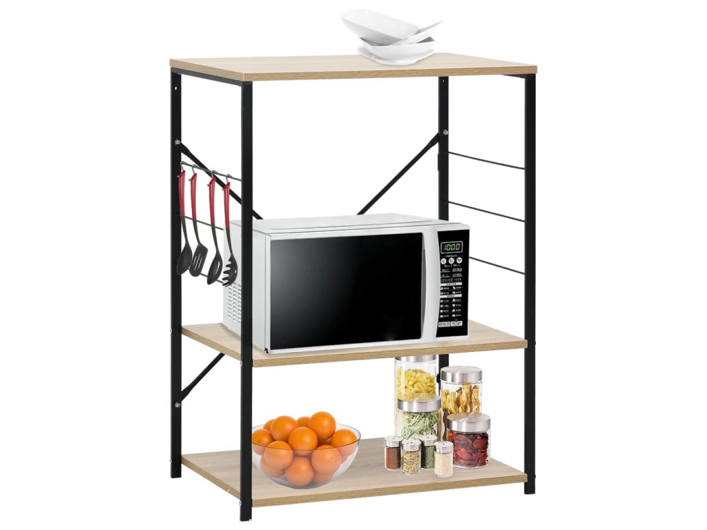 Tato kuchyňská police je zhotovená z kompozitního dřeva, takže se snadno čistí vlhkým hadříkem. Ocelová konstrukce je antikorozní a přispívá k její robustnosti. Tento regál má 3 úrovně, které vám poskytnou dostatek prostoru pro ukládání věcí. Na boku skříňky jsou háčky pro zavěšení hrnců, pánví, nádobí, kuchyňských chňapek a spoustu dalšího. Můžete ji také použít v obývacím pokoji nebo kanceláři k vystavení svých sběratelských předmětů, zarámovaných fotografií atd.