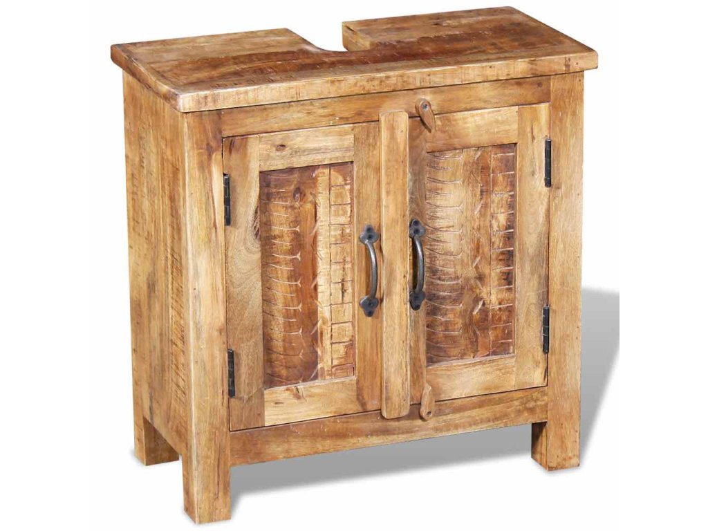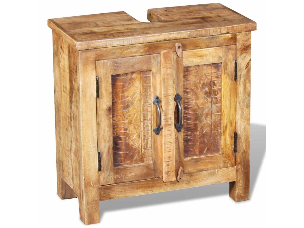 Skříňka pod umyvadlo a rám zrcadla jsou vyrobené z masivního mangovníkového dřeva, což činí tento koupelnový nábytek stabilní, pevný a odolný. Řemeslné zpracování a krásná struktura dřeva dává každému nábytku jedinečný a od všech ostatních odlišný charakter.