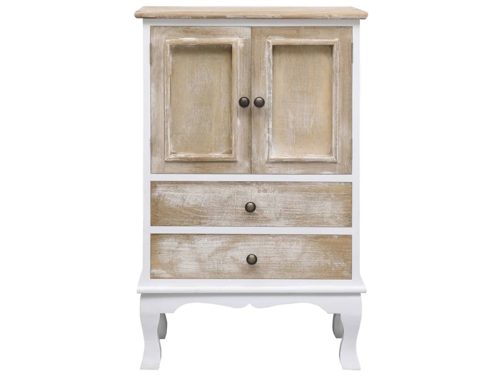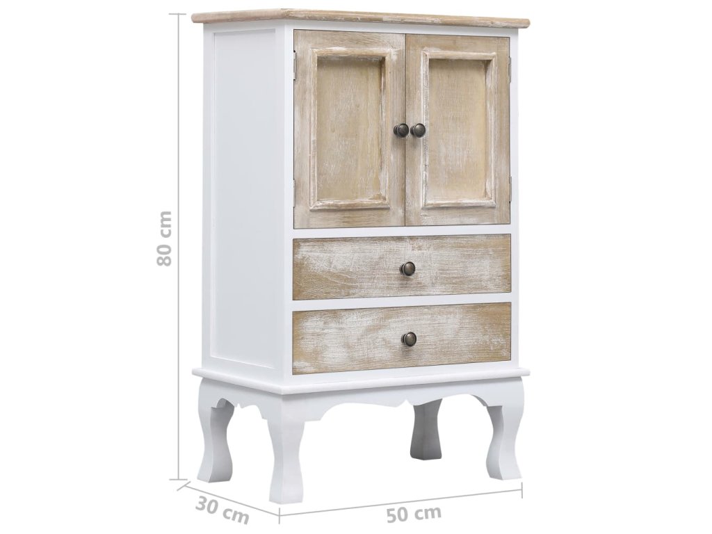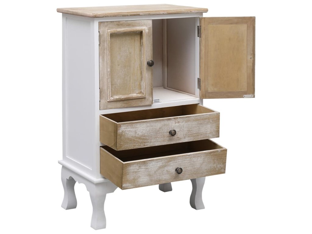Tato skříňka je vyrobena z kvalitního dřeva pavlovnie a topolu a MDF desky, je tedy mimořádně robustní a má dlouhou životnost. Má 2 zásuvky a 2 dvířka a poskytuje dostatek úložného prostoru pro vaše osobní potřeby, jako jsou klíče, poznámkové bloky, knihy, časopisy nebo jiné drobnosti a nezbytnosti.