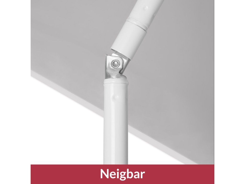 Polyesterový potah s vodoodpudivou úpravou a UV ochranou 50+ spolehlivě chrání před slunečním zářením i lehkým letním deštíkem. Výškově nastavitelná tyč (115–190 cm) a naklápěcí kloub (45°) umožňují přizpůsobit stínování podle potřeby.