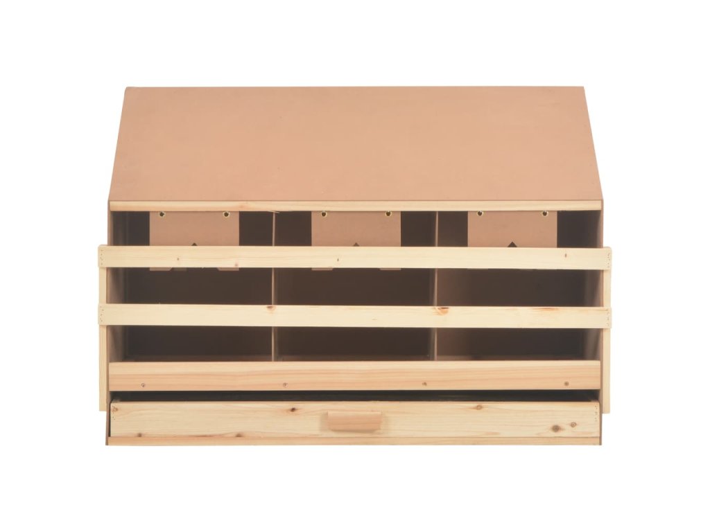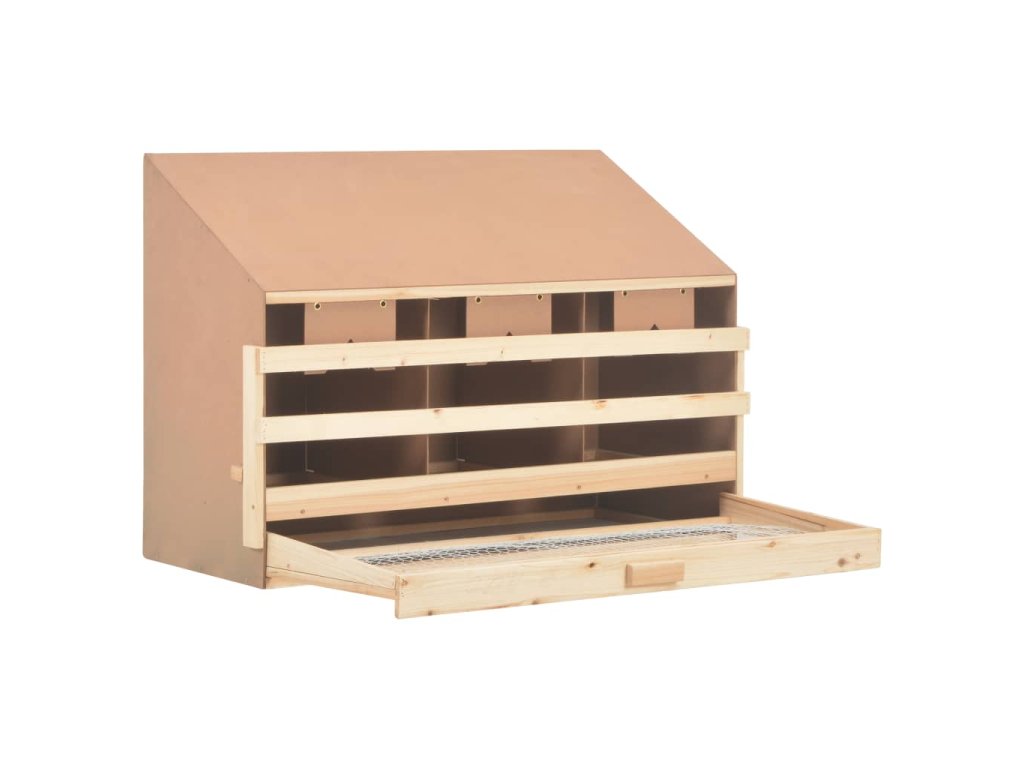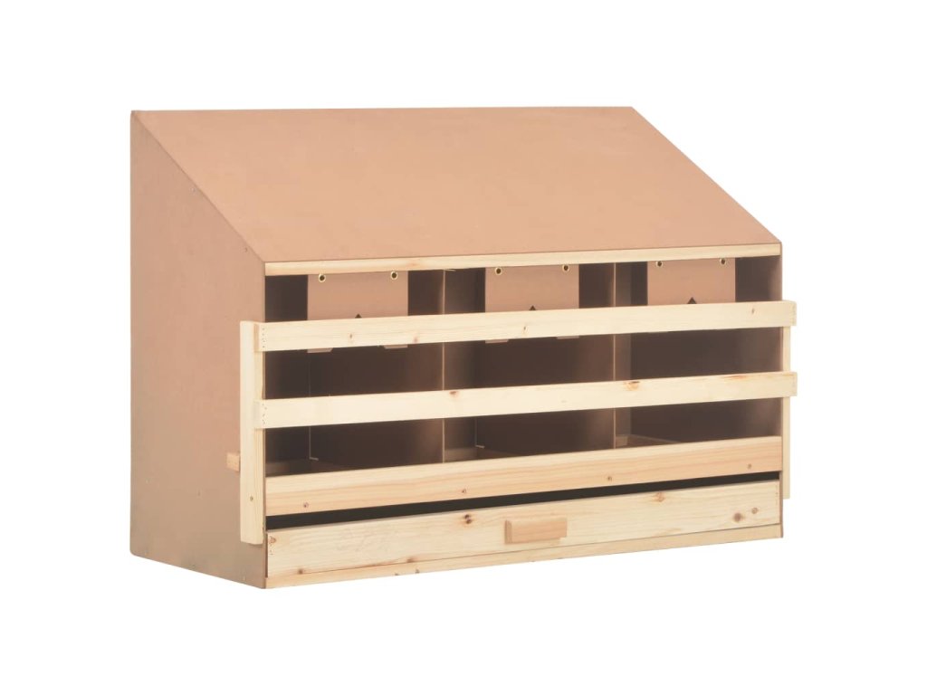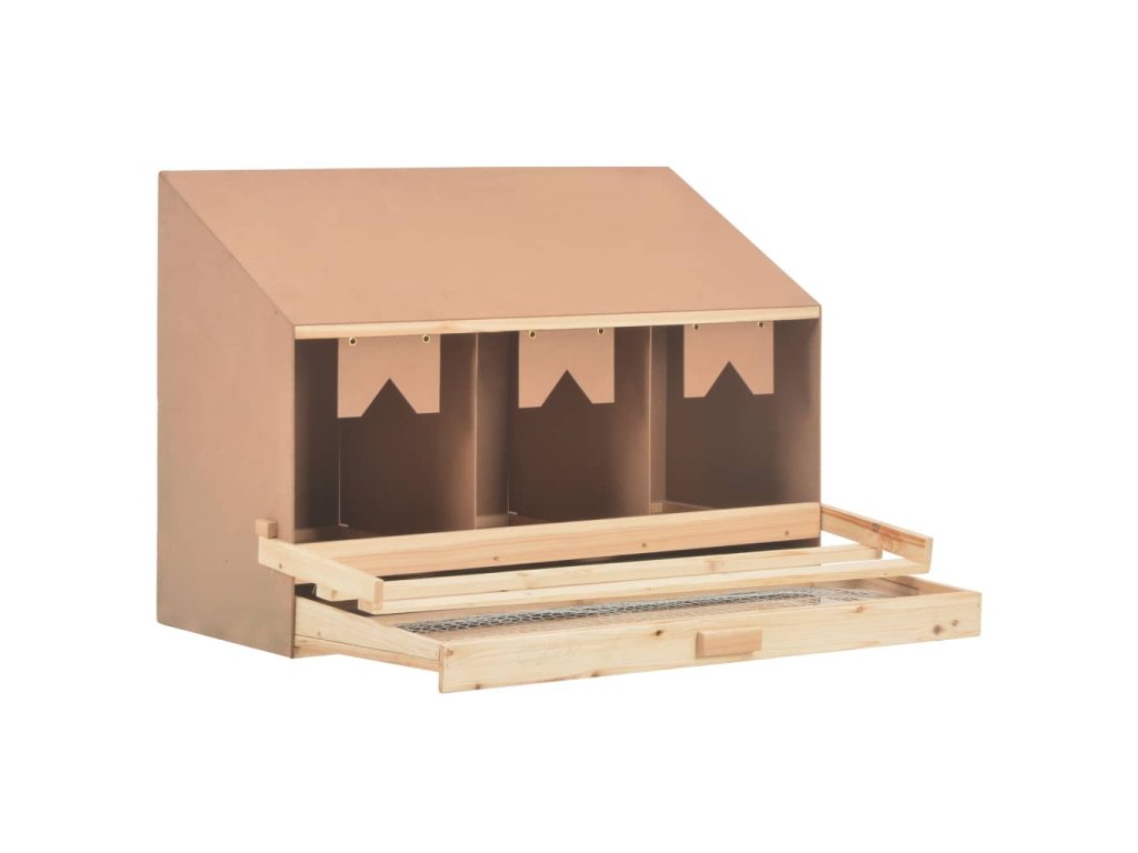 Tři prostorné boxy jsou určené pro 3 velké slepice, které se zde mohou pohodlně uvelebit a snášet vejce. Vejce šetrně padají skrz otvory v podlaze do spodní zásuvky, což usnadňuje jejich sbírání. Vysouvací dno umožňuje jednoduché čištění. Hřady lze složit, abyste zabránili nočnímu hnízdění. Šikmá střecha slepicím znesnadňuje přizvednout se ve snáškovém hnízdě a kontaminovat vejce. V našem obchodě najdete rovněž snášková hnízda s plochou střechou.