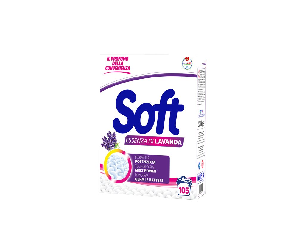 Univerzální prací prášek od italské značky Soft, který vyniká svými kvalitním pracími účinky a příjemnou levandulovou relaxační vůní, která na prádle vydrží opravdu dlouho. Prací prášek je vhodný i v případě praní bez aviváže a následnému sušení v sušičkách prádla.