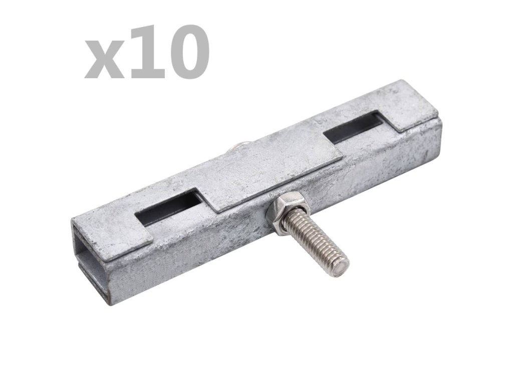 Spona na zahradní pletivo je vyrobená z pozinkované oceli, která zajišťuje dlouhodobou životnost. Balení obsahuje 10 sad v jedné krabici, každá sada se skládá ze 2 spon tvaru U, 1 vratového šroubu a 1 rohatkové matice.