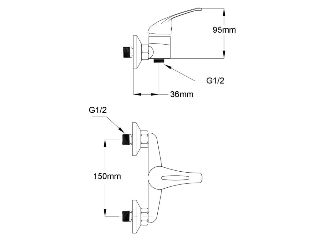 - Vzdálenost mezi středy trubek pro studenou a horkou vodu: 150 mm