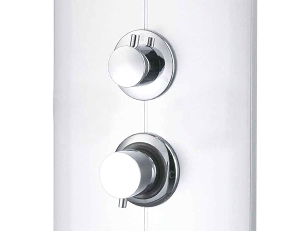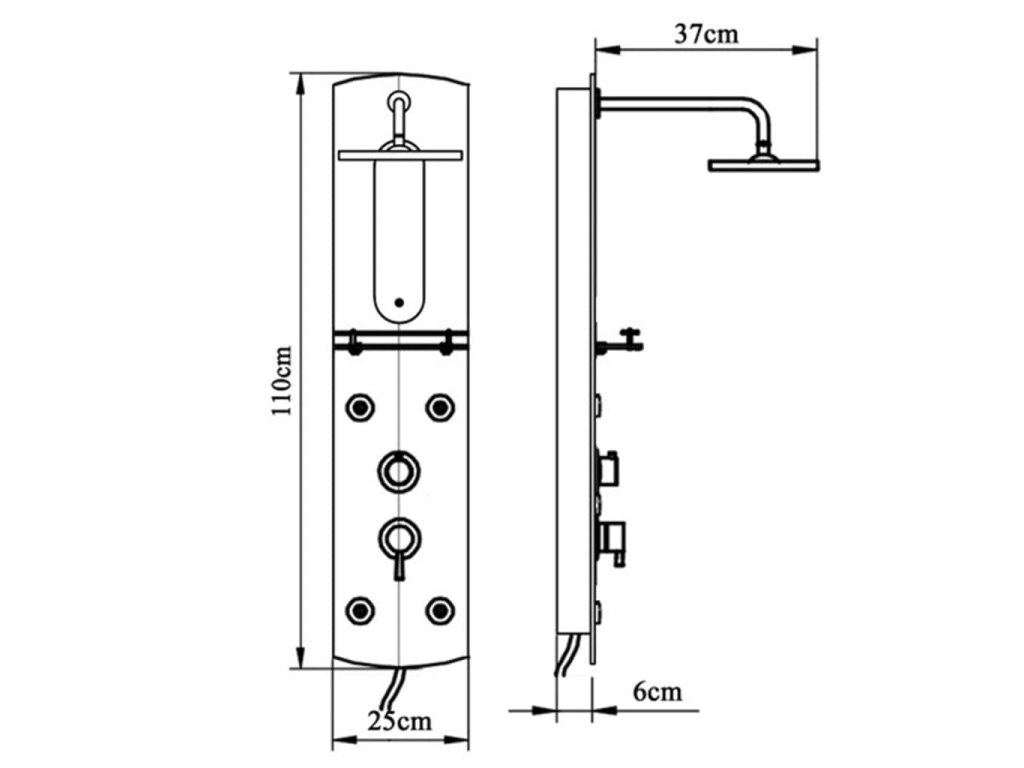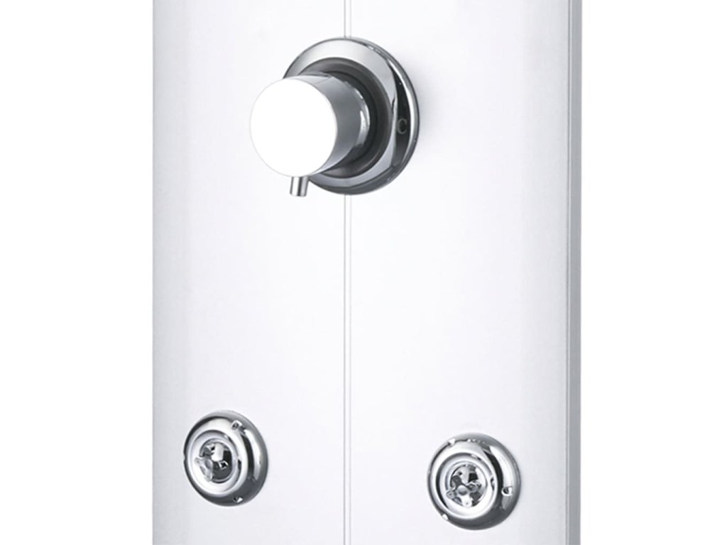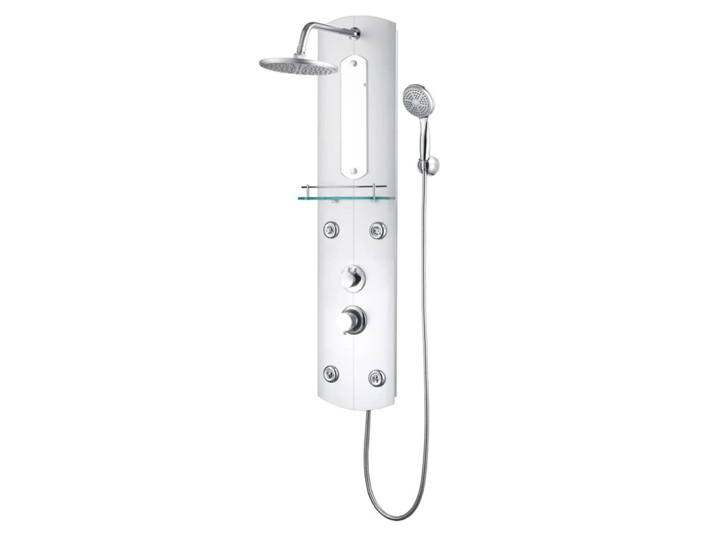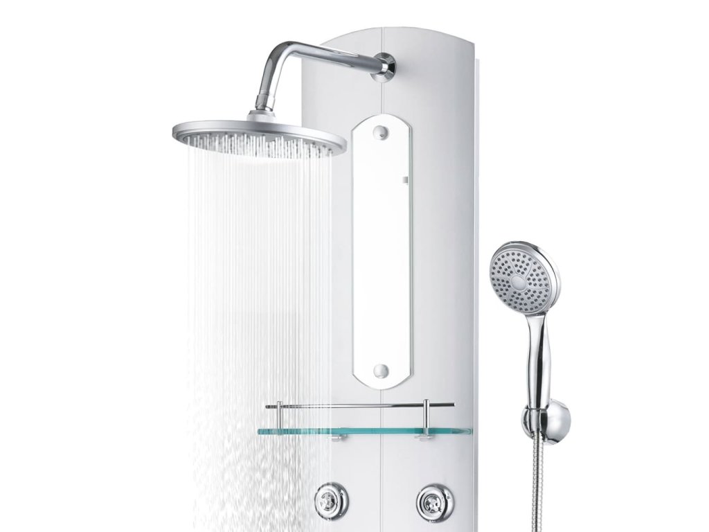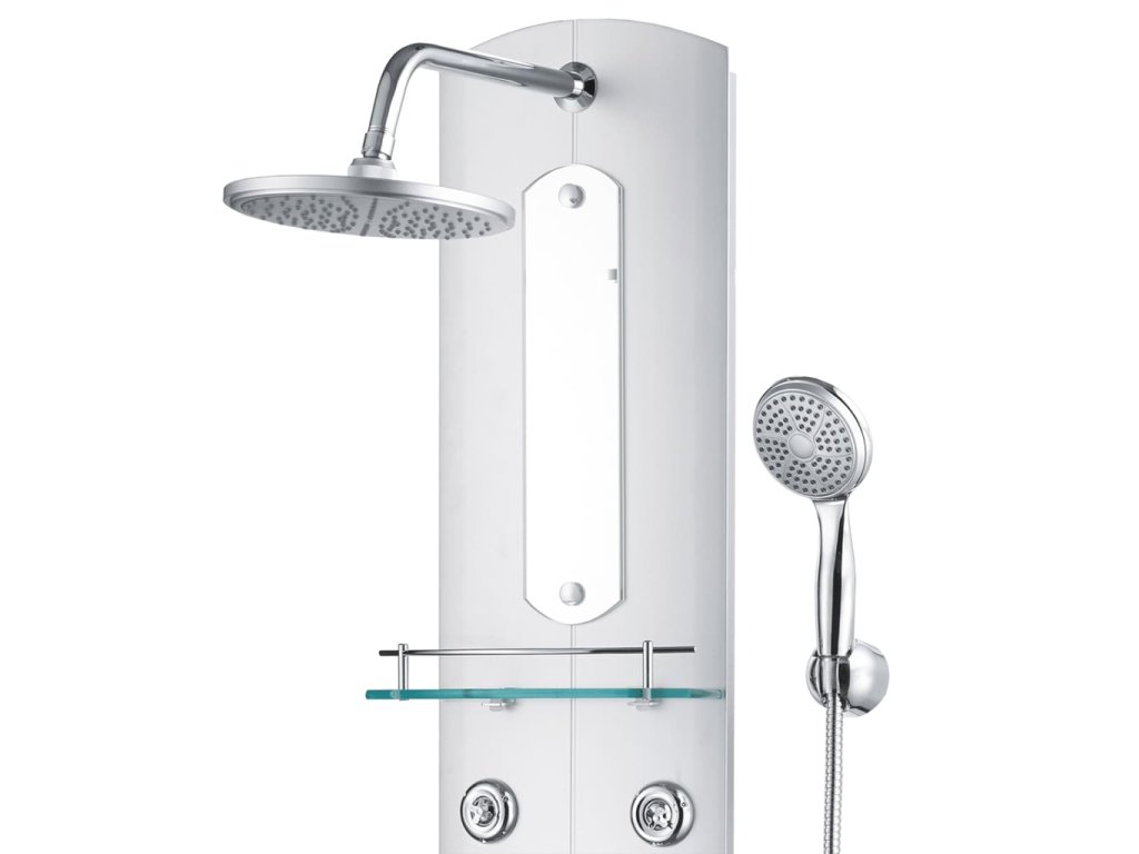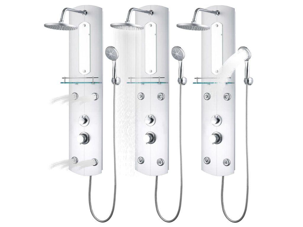 Hlavní část sprchového panelu je vyrobena z umělé hmoty, je tedy lehká a dá se snadno přesouvat. Panel nabízí tři režimy sprchování: déšť, hydromasážní trysky a ruční sprchu, mezi nimiž se dá snadno přepínat. Na sprchovém panelu se rovněž nachází malé zrcadlo. Je tam také skleněná polička, kam si můžete položit potřeby ke sprchování. Silikonové trysky jsou odolné vůči usazování vodního kamene.