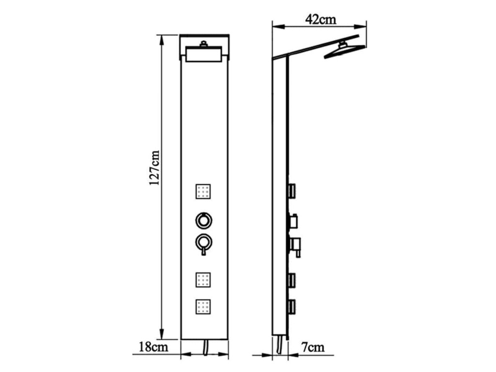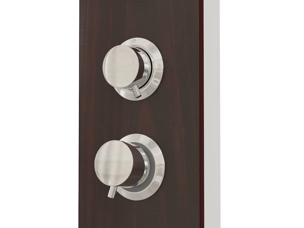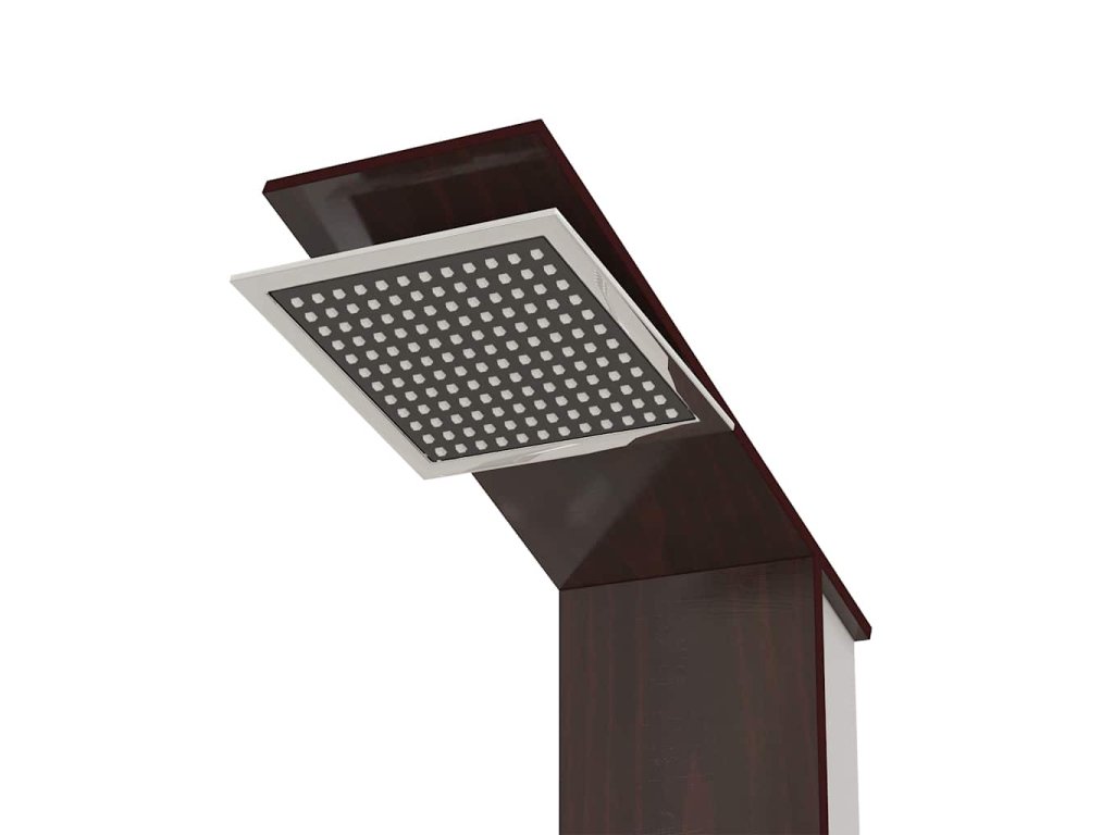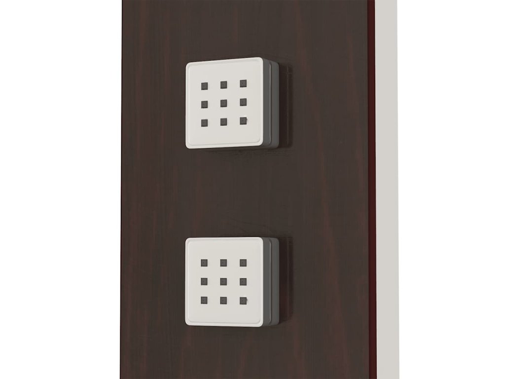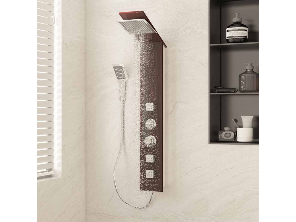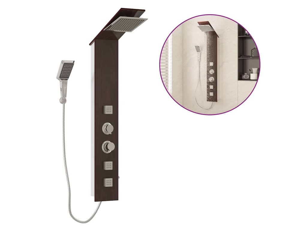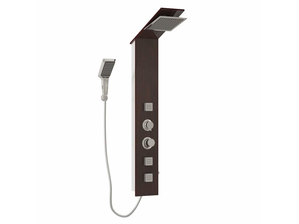 Sprchový panel je vyrobený z velmi kvalitního skla s krásným potiskem imitujícím kresbu dřeva.Má tři funkce: tropický déšť, hydromasážní trysky a ruční sprcha, které se snadno ovládají pomocí otočného přepínače.