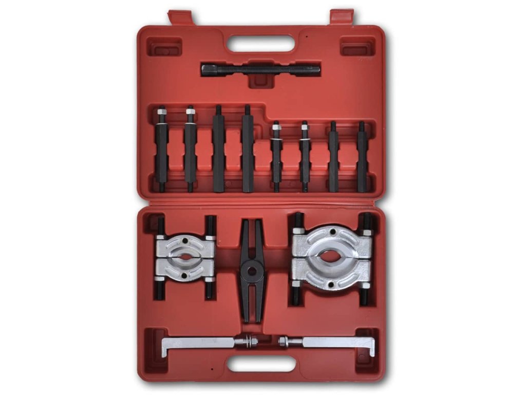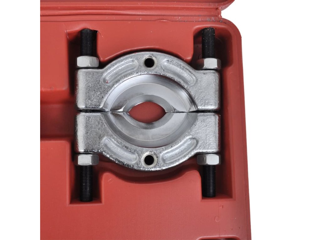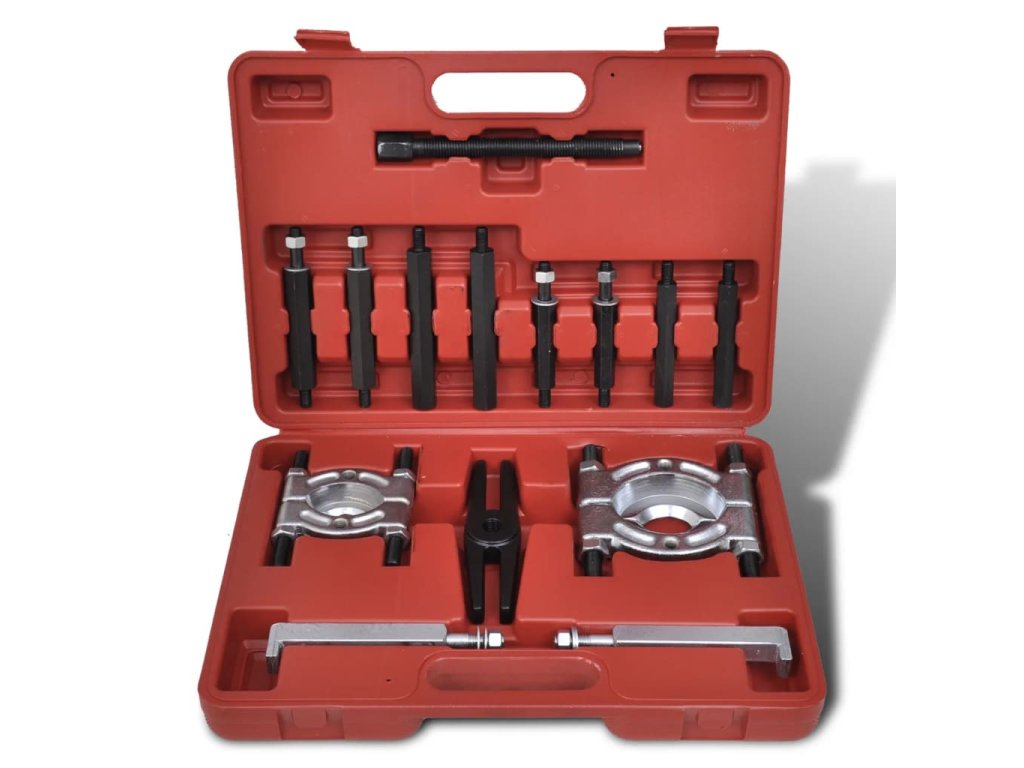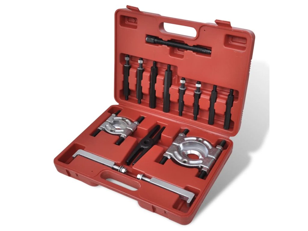 Tento stahovák ložisek je vhodný pro odstranění ložisek , kladek a volantů . Hodí se k provádění této činnosti na autech a jiných dopravních prostředcích Dodáváme 2 ložiskové štípače s 2 " a 3 " čelistmi , 1 nosník typu H , 1 vodící šroub , 6 adaptérů svěráku , 2 ks 5 " rozšiřovací šrouby s vnějším a vnitřním závitem , 2 ks 4 " rozšiřovací šrouby s vnějším a vnitřním závitem , 2 ks 5 " rozšiřovací šrouby s vnějším závitem , 2 ks 4 " rozšiřovací šrouby s vnějším závitem . Díky tom , že je vyroben z kvalitní oceli je tento stahovák trvanlivý a bude vám sloužit dlouhá léta . Všechno nářadí je uloženo v pevném kufříku , aby se jednoduše skladováno a přenášelo .