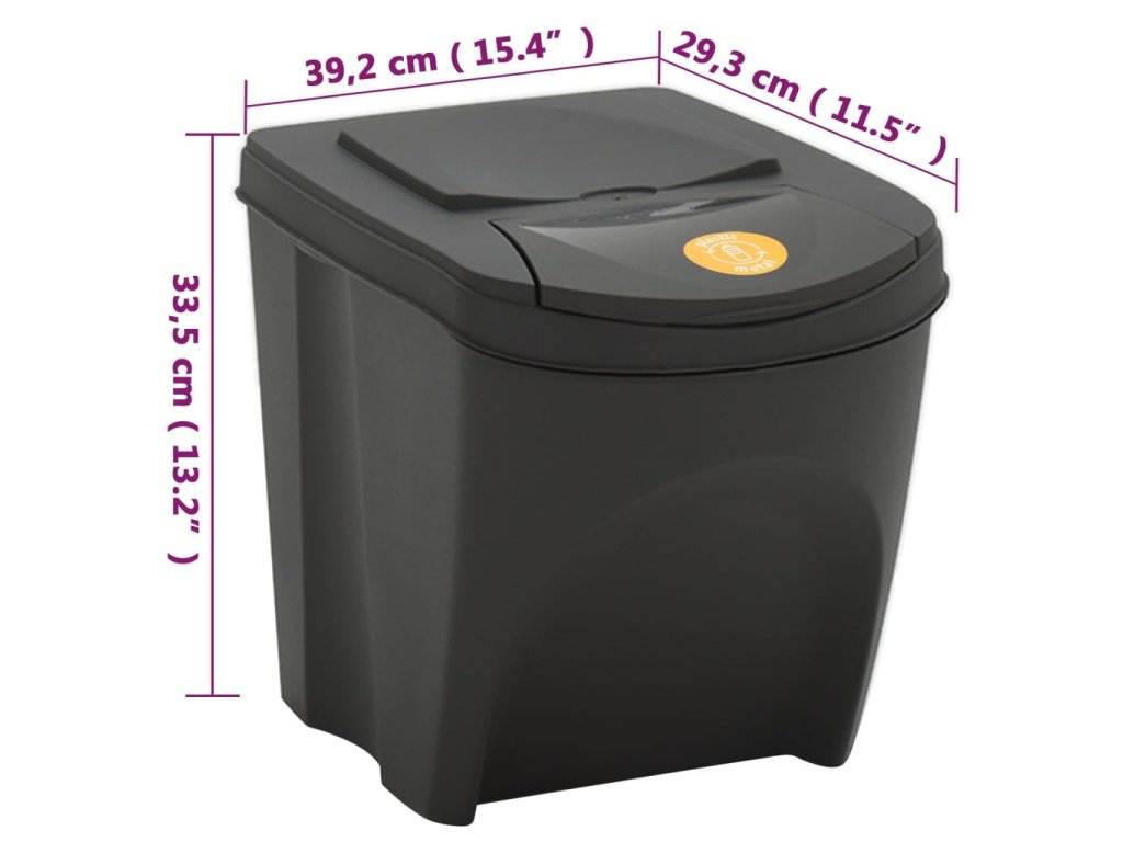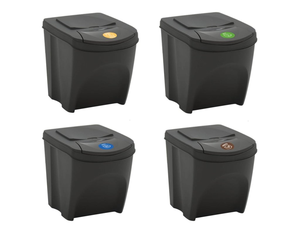 - Obsahuje štítky na třídění odpadu pro každý koš (sklo, papír, plast, organické látky, jiné)
