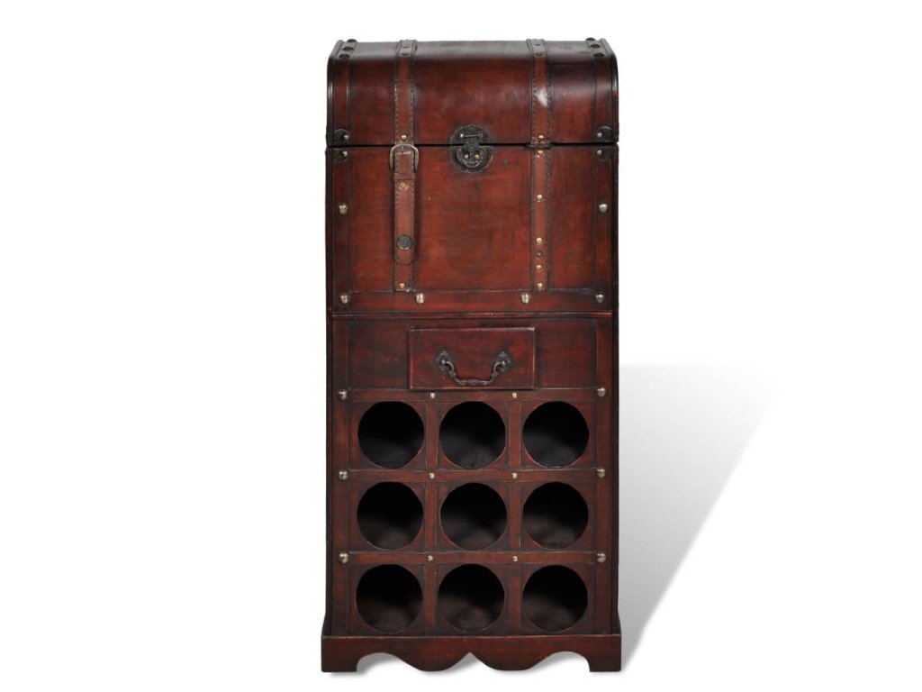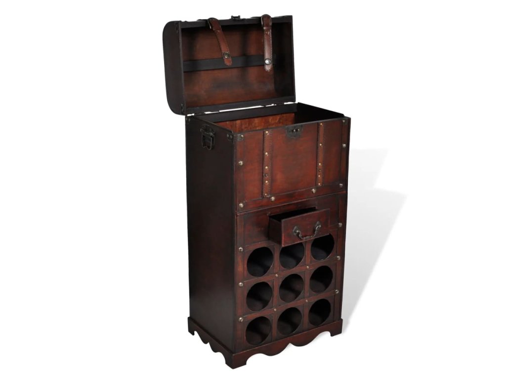 Toto je dokonalý stojan na víno pro milovníky vína. Tento elegantní stojan na víno, vhodný ke skladování většího počtu lahví, bude výrazným kusem nábytku ve vaší kuchyni, jídelně, obývacím pokoji apod. Tento stojan na víno s místem na 9 lahví, úložnou truhlou a zásuvkou na doplňky pojme vše nezbytné pro přípravu a vychutnání si sklenice vína.