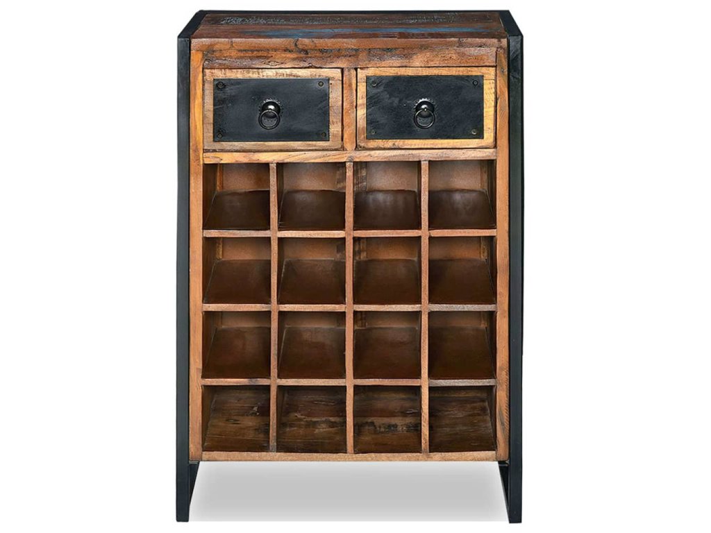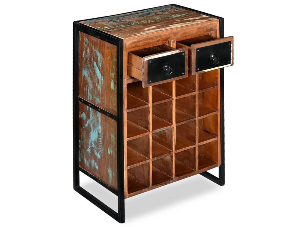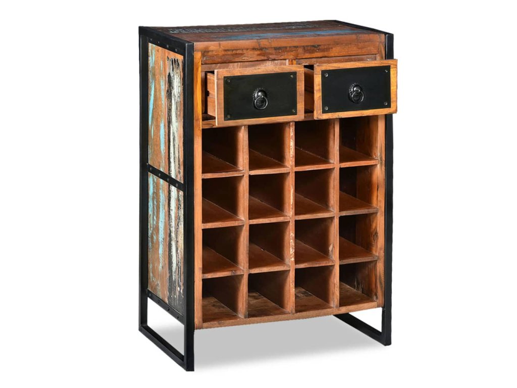 Dřevěný stojan na víno je zhotovený v industriálním stylu a je perfektní pro milovníky vína. Je okouzlující a do vaší kuchyně, jídelny či obývacího pokoje přinese starosvětský šarm. Pojme až 16 lahví a má 2 šikovné zásuvky, kam si můžete ukládat nejrůznější doplňky. Tato domácí vinotéka vám nabídne vše potřebné, abyste si mohli vychutnat svou sklenku vína.