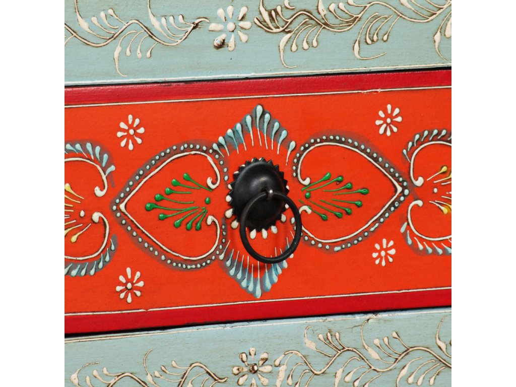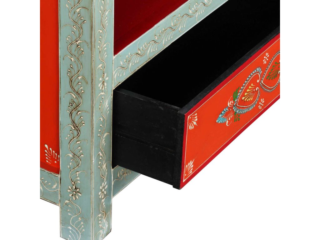 Stolek pod TV je vyroben z mangovníkového dřeva, které je nejen líbivé, ale také odolné. Jeho retro vzhled navíc podtrhuje zručné řemeslné zpracování. Skříňka na multimediální zařízení je ručně malovaná. Její bohaté zdobení z ní činí elegantní, rafinovaný kousek. Praktické úchytky, které se k ní perfektně hodí, usnadňují otevírání zásuvek.