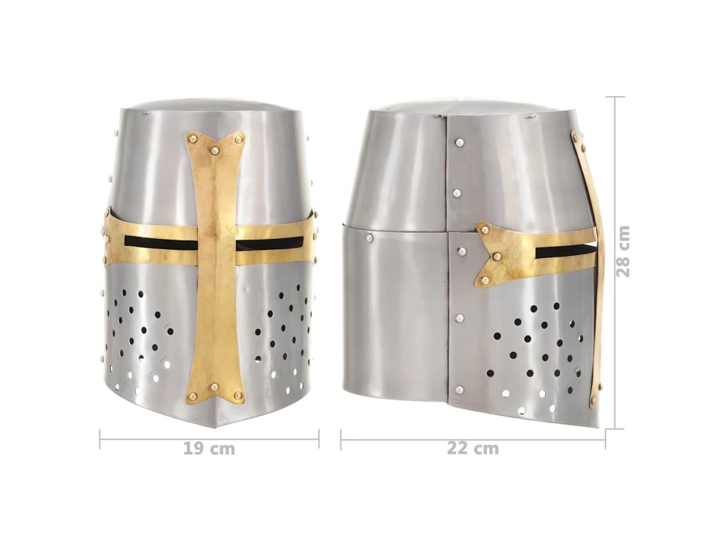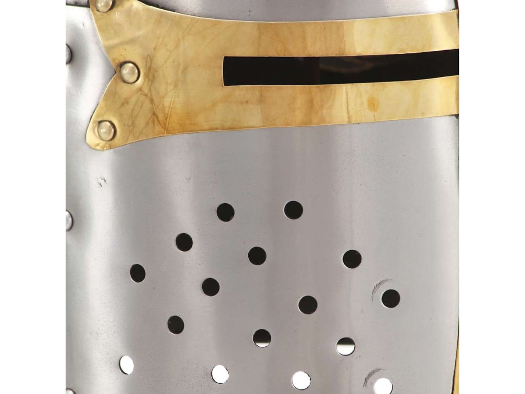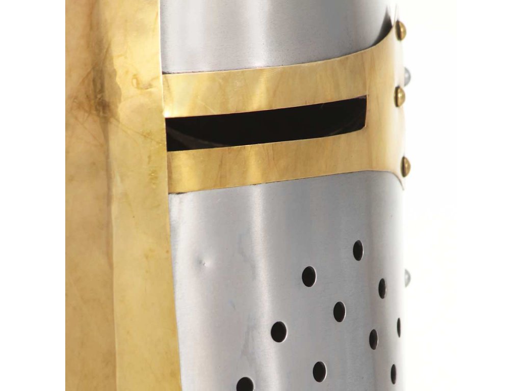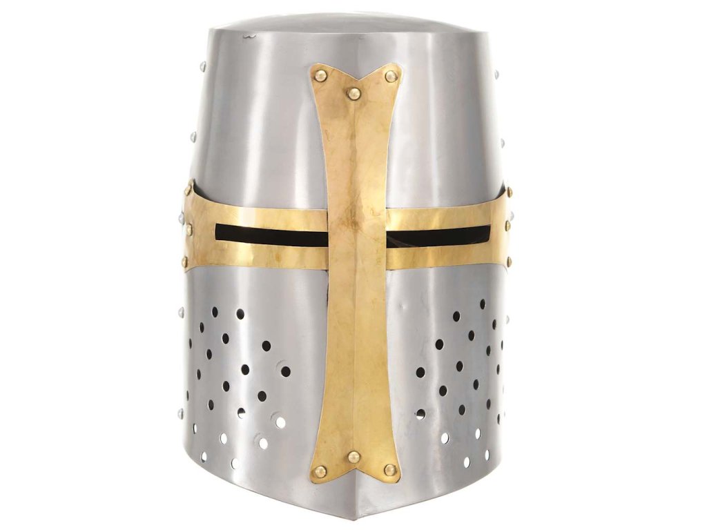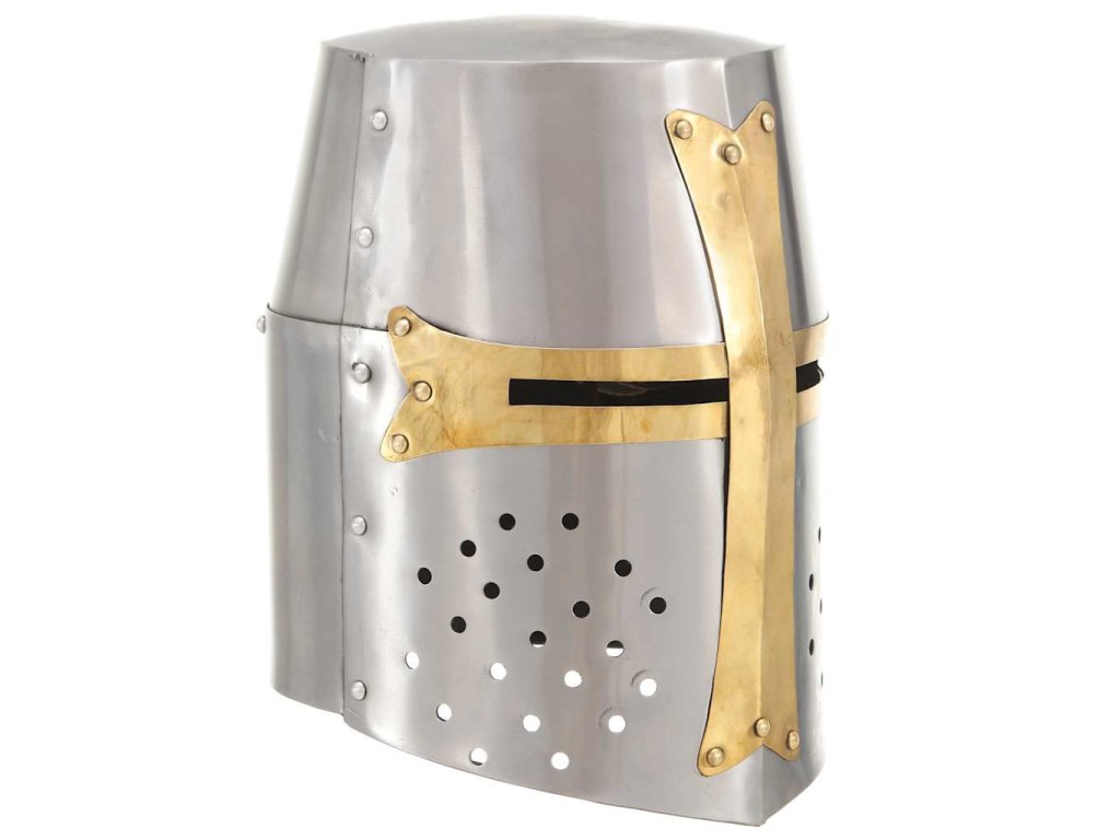 Rytířská helma je přesná replika původní křižácké rytířské helmy. Je zhotovená z oceli 18. Kombinací původního designu s odolným materiálem vznikla působivá helma, která dokonale doplní vaši stávající rytířskou výbavu. Přilba je plně nositelná a zaručuje excelentní ochranu. Malé otvory a průzory slouží k ventilaci a dobrému výhledu. Jedná se také o působivý výstavní kousek.