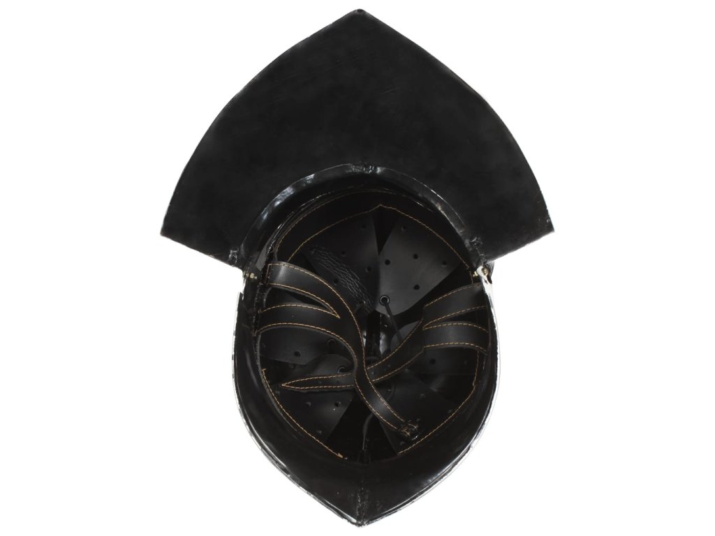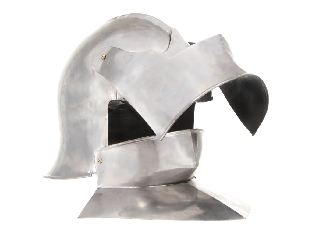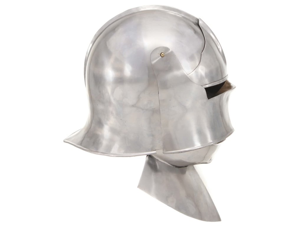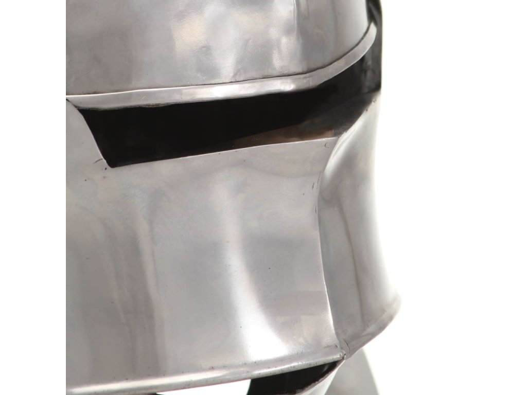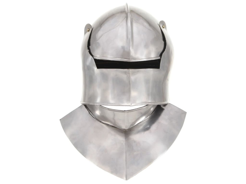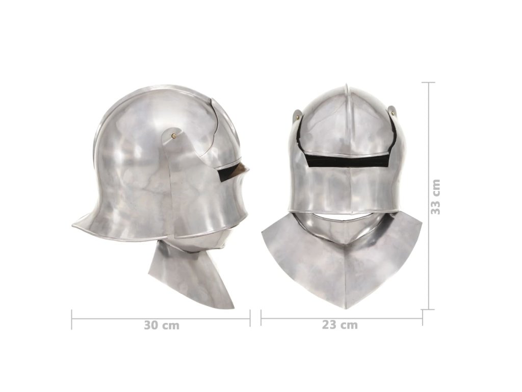 Helma je přesná replika původní středověké rytířské přilby. Je zhotovená z oceli 18. Kombinací původního designu s odolným materiálem vznikla působivá helma, která dokonale doplní vaši stávající zbroj. Přilba, která zcela zakrývá hlavu, je plně nositelná. Malé otvory a průzory slouží k ventilaci a dobrému výhledu, nákrčník chrání také týl a krk. Jedná se také o působivý výstavní kousek.