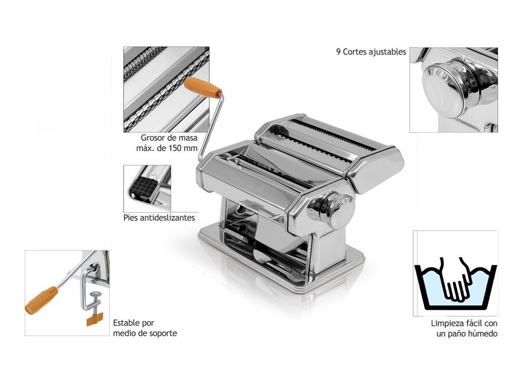 Díky nastavitelným válcům si můžete vybrat z 9 různých tlouštěk těsta – od tenkých lasagní po silné těstovinové pásy. Kvalitní kovové zpracování zajišťuje dlouhou životnost a stabilitu. Stroj se upevňuje na desku stolu pomocí přiložené svorky, takže zůstává bezpečně na místě i při intenzivním hnětení a válcování.