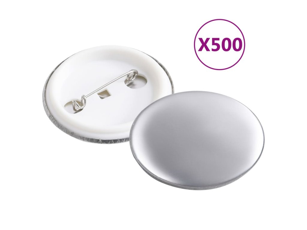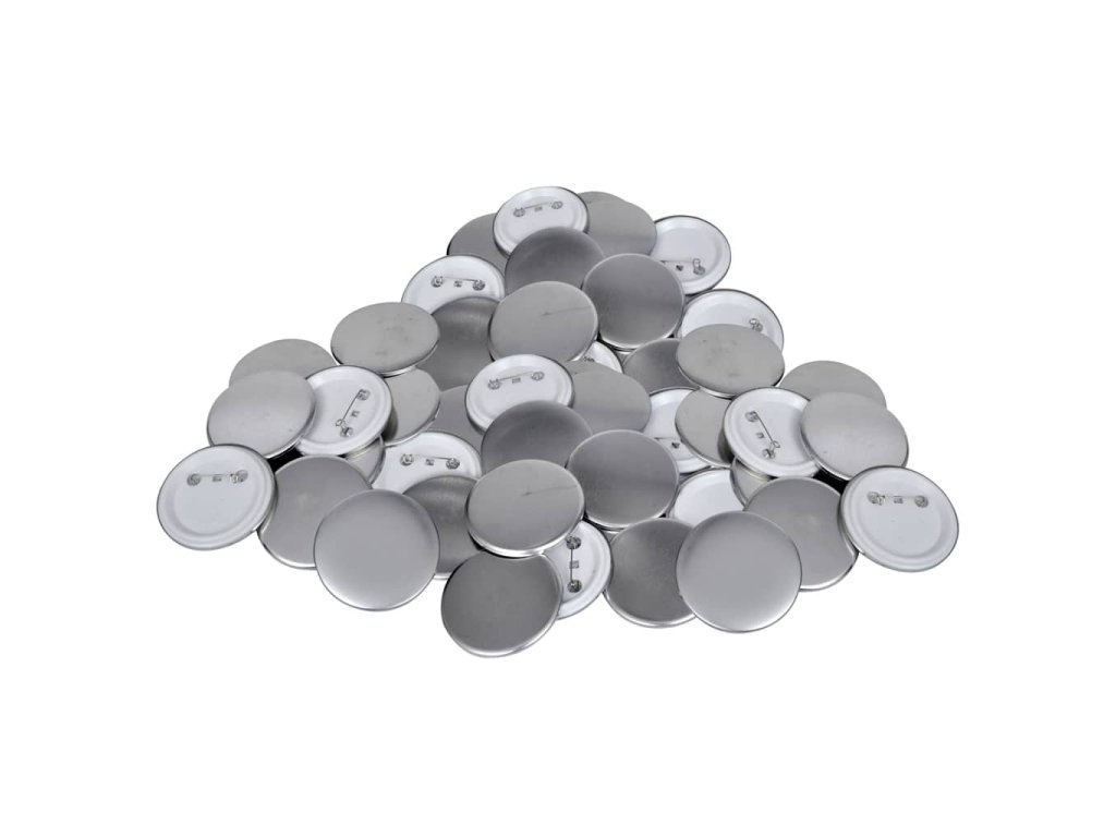 - Kompletní set butonů s kovovým předním dílem, krycí fólií a zadním dílem se špendlíkem