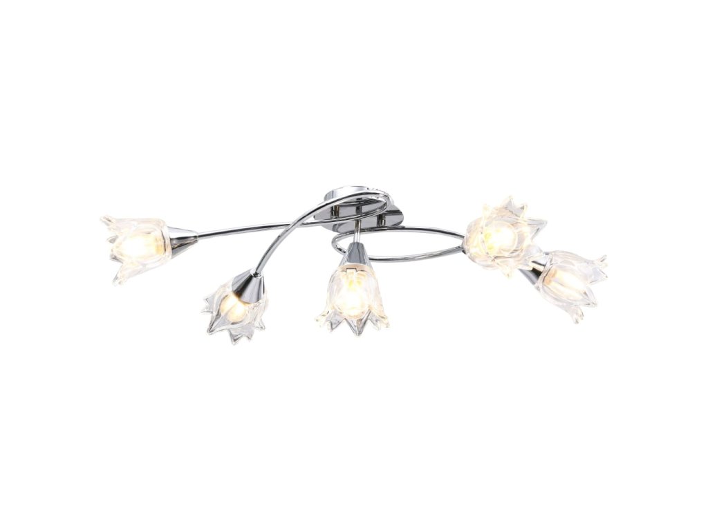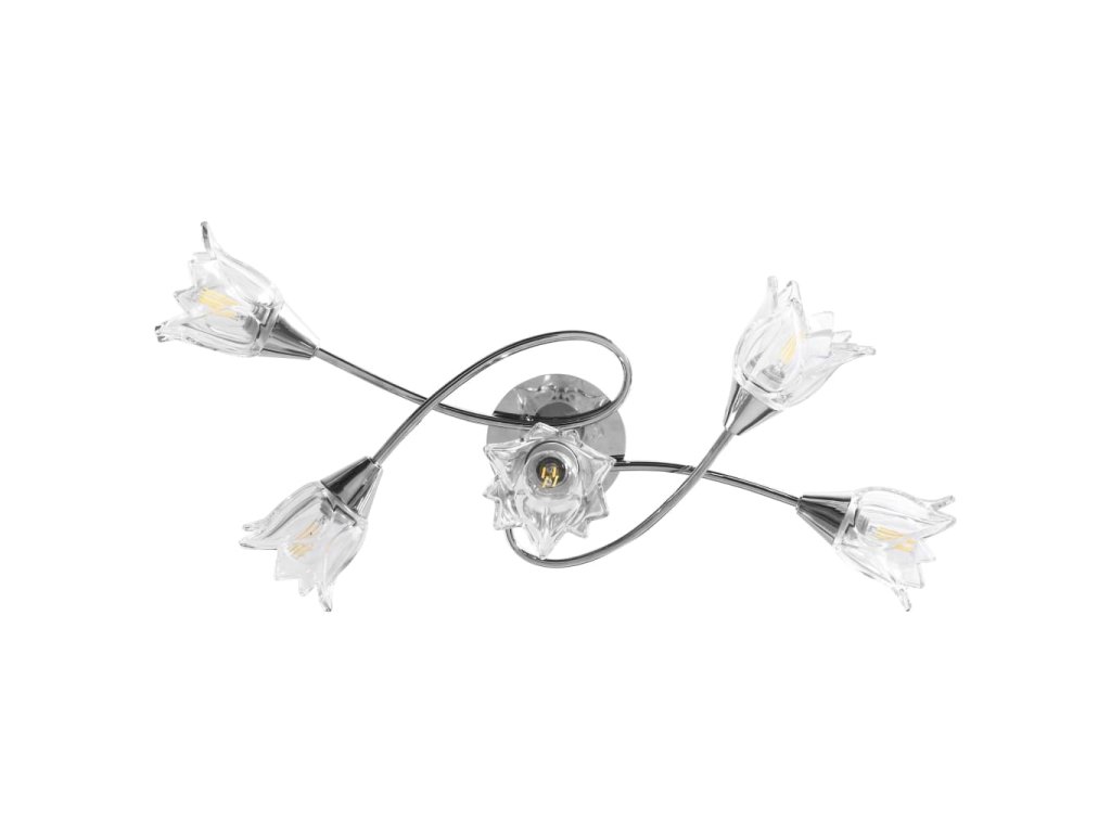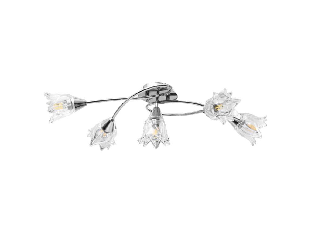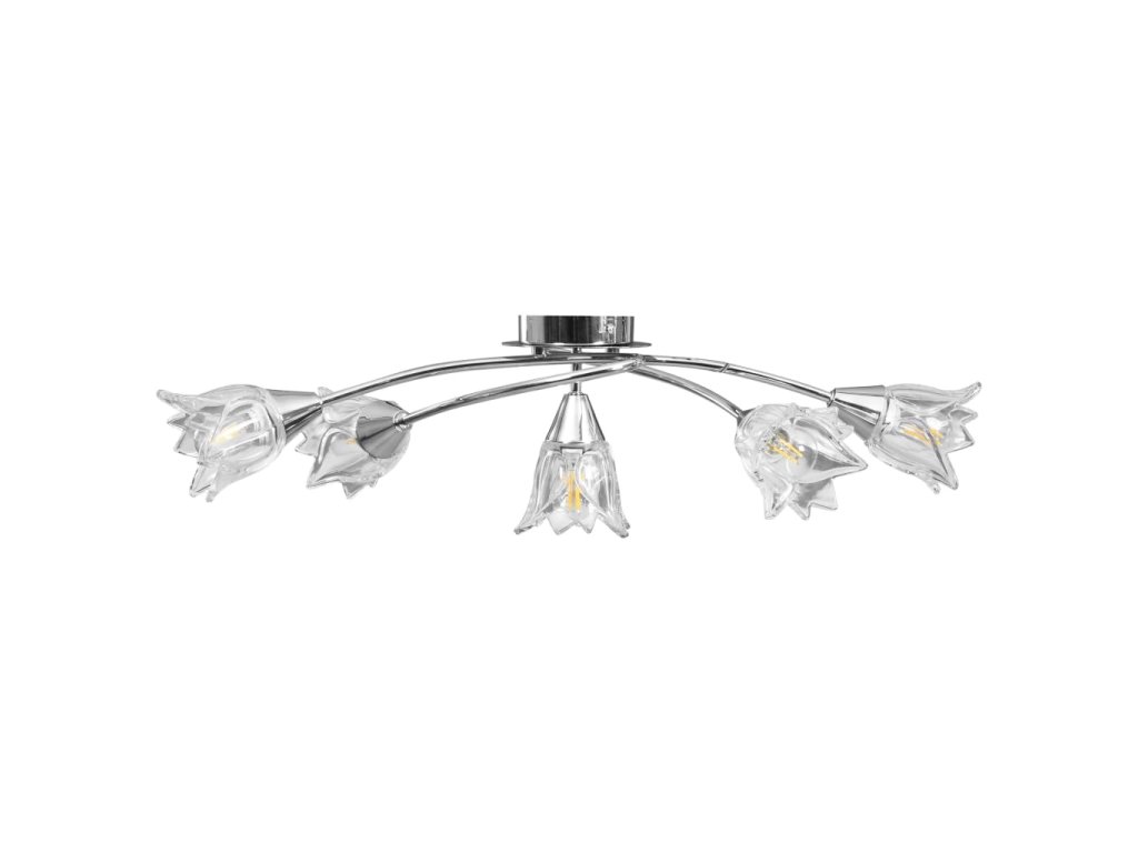 Světlo bez problémů namontujete na všechny typy stropů, jelikož disponuje odolnou kovovou základnou. Elegantní vzhled pak doplňuje pět propletených ramen z pochromované oceli a průhledná skleněná svítidla ve tvaru tulipánů. Saténový chromovaný povrch působí moderním dojmem, takže se svítidlo skvěle hodí do obývacího pokoje nebo ložnice všech stylů zařízení. Lampa se snadno čistí a udržuje – postačí vám navlhčený hadřík.