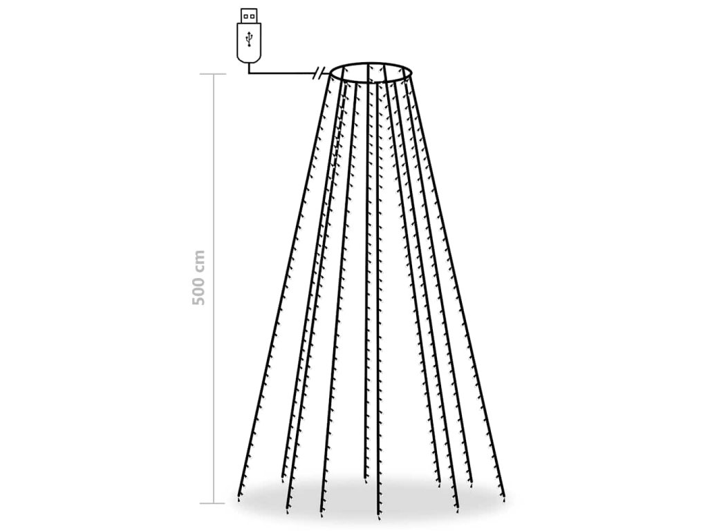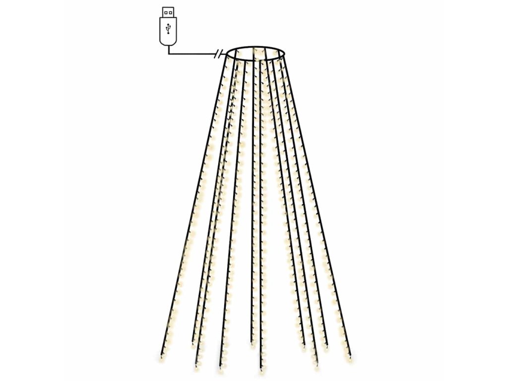 Poznámka: Dodaný USB konektor není voděodolný a je třeba ho chránit před vodou. Přesto můžete výrobek používat venku, protože kabel o délce 10 m a samotný produkt jsou voděodolné. Důležité upozornění: Vánoční stromek a baňky nejsou součástí balení. Produkt je vybaven USB konektorem, ale certifikovaný napájecí zdroj 5V USB není součástí dodávky.