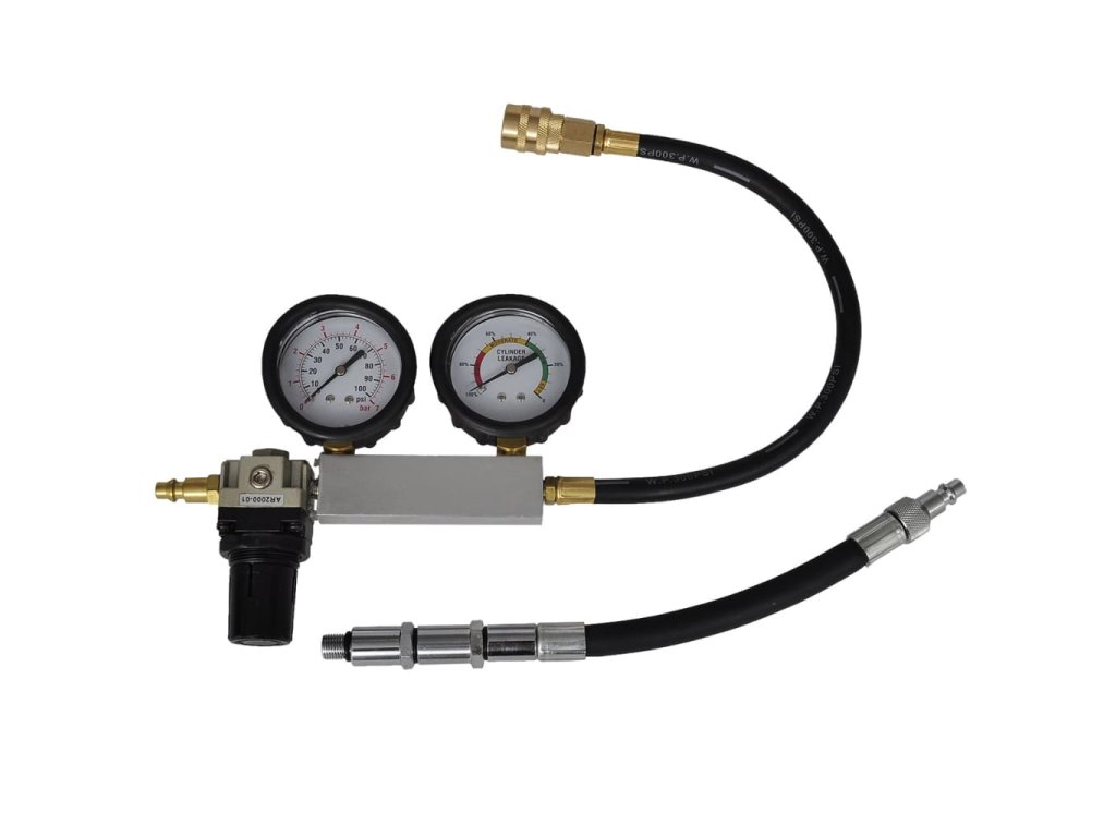 Tento tester těsnosti válců rychle diagnostikuje vnitřní problémy motoru, jako jsou špatné kroužky, ventily a poškozené těsnění hlavy. Dvojitá měřidla jsou vybavená kovovou lunetou s robustním pryžovým vnějším obalem. Vstupní měřidlo má stupnici v rozmezí 0–100 psi, druhé (testovací) měřidlo měří % netěsnosti. Tento přípravek na kontrolu těsnosti ukazuje 0 až 100% únik v 5% odstupech. Snadno čitelné měřidla jsou navržená pro účinná testování a přesné výsledky.
