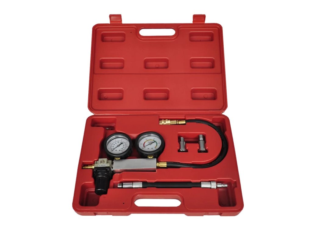 Všechny nástroje dodáváme v pouzdře z foukaného plastu pro snadné skladování a přepravu. Balení obsahuje manometr, tester těsnosti válce, 2 x adaptér na zapalovací svíčku, hadici pro rychlé připojení/odpojení a regulátor.