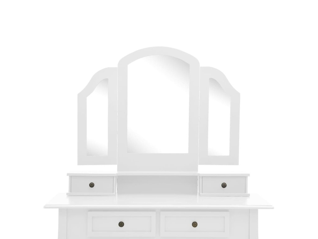 Toaletní stolek je opatřený zrcadlem 3 v 1. Po stranách hlavního zrcadla jsou umístěná dvě zrcadla, která jsou připevněná k hlavnímu zrcadlu odolnými panty. Proto je můžete natočit do požadovaného úhlu. Určitě vás mile překvapí, že zrcadlo a stolek můžete používat odděleně. Ve stolku jsou 4 chic zásuvky, které slouží jako další úložný prostor na vaše šperky, kosmetiku nebo vaše osobní věci. Ať už se rozhodnete umístit tento kosmetický stolek se stoličkou kamkoliv, jistě se stane středem pozornosti.