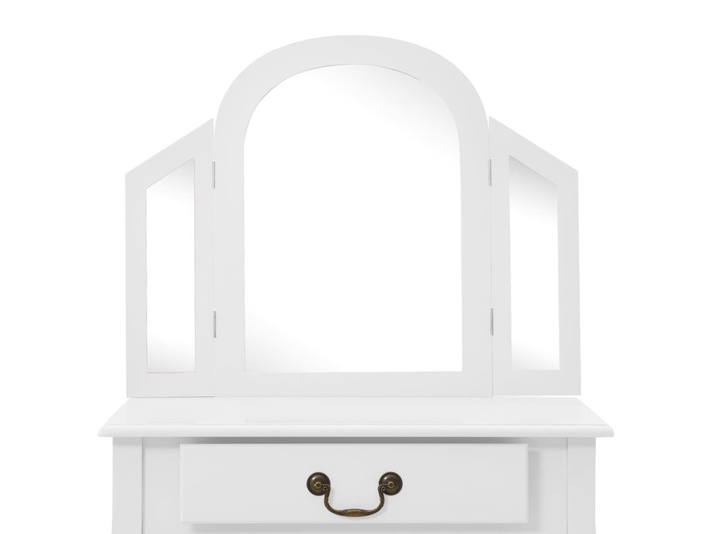 Tento kosmetický stolek s oválným zrcadlem a stoličkou je završením každé ložnice. Zásuvka nabízí dostatek prostoru pro úhledné ukládaní kosmetiky pro každý den. Na stoličce s vysokým polstrováním se vám při líčení bude velmi dobře sedět. Když stoličku právě nepoužíváte, můžete ji zasunout pod stolek a ušetřit místo. Stolek má také dlouhou životnost a snadno se udržuje.