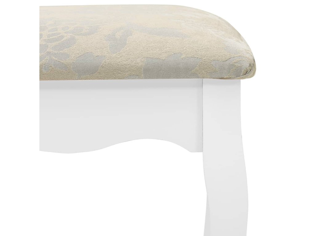 Tato toaletka, vyrobená z vybraného dřeva pavlovnie, zaujme svou jedinečnou siluetou a luxusně designovanými nohami. Čtyři zásuvky různých velikostí a otevřená přihrádka nabízí ideální prostor pro uložení líčení a šperků. Na desku stolku si můžete vystavit lahvičky s parfémem nebo jiné dekorace. Stolička bez opěradla má polstrovaný sedák a sladěné dřevěné nohy. Vestavěné vykládané zrcadlo je zasazené v atraktivně vytvarovaném rámu, který setu přináší moderní šarm.