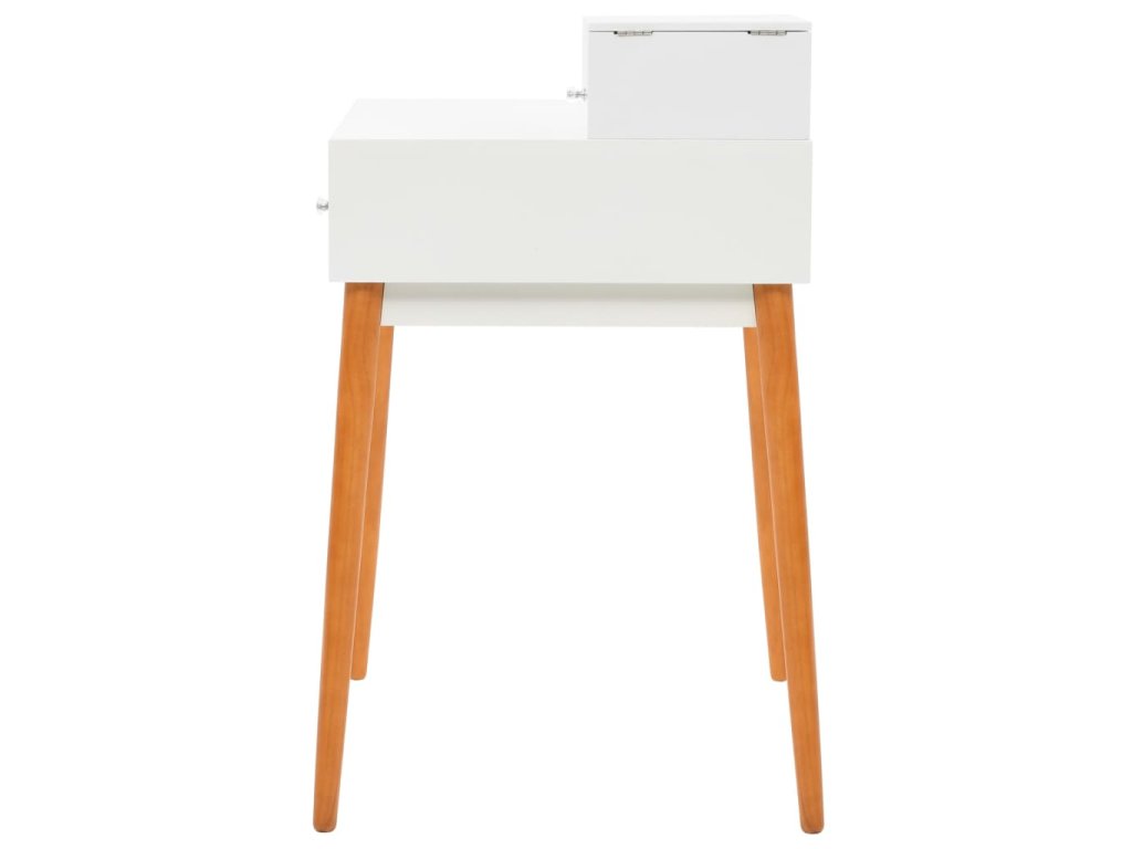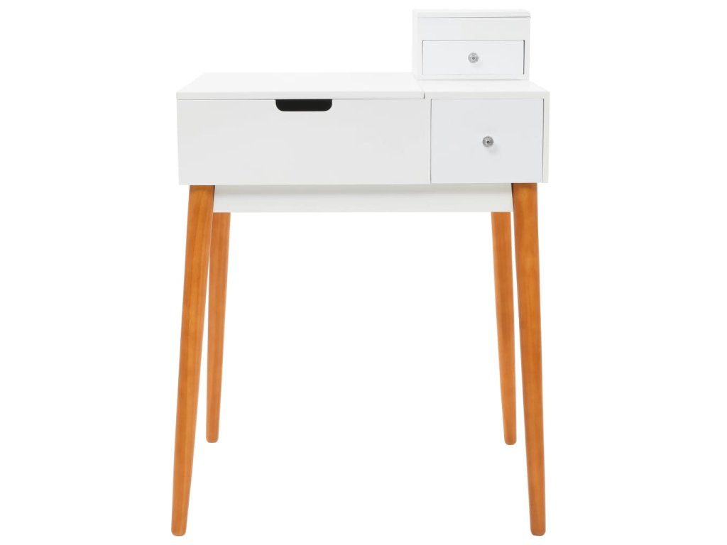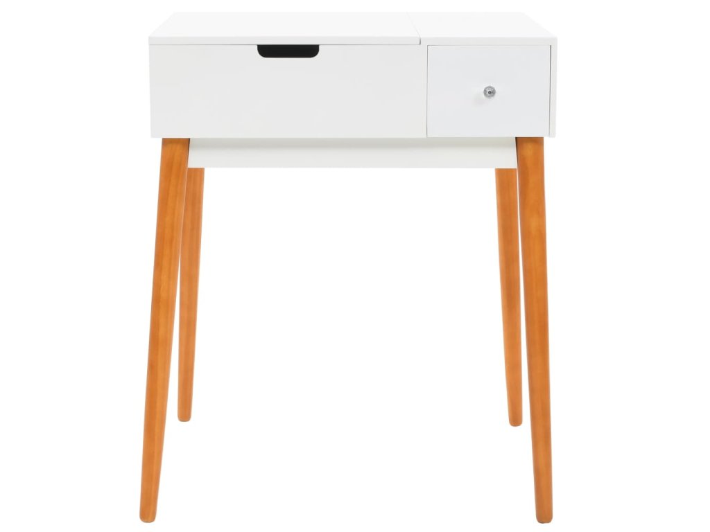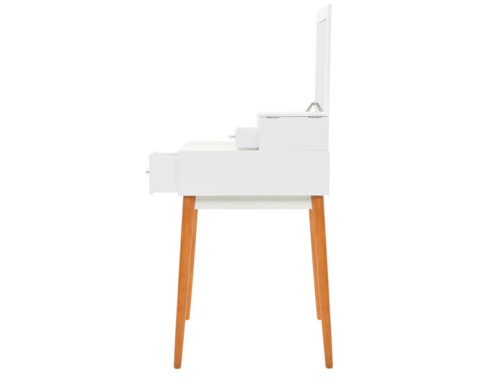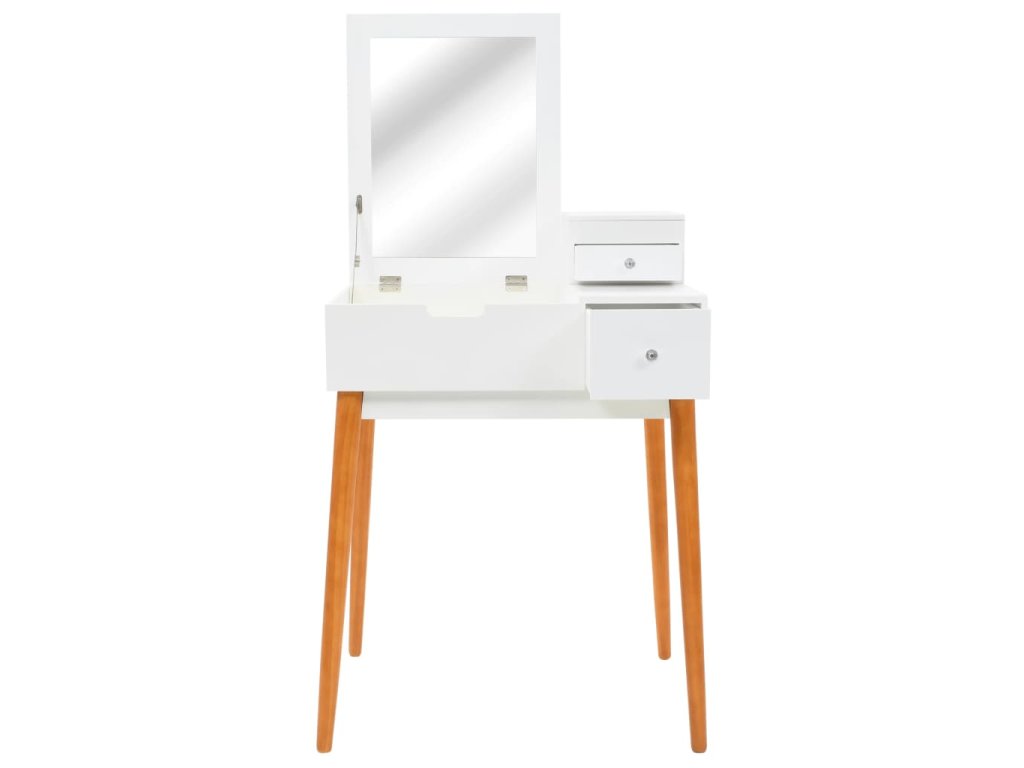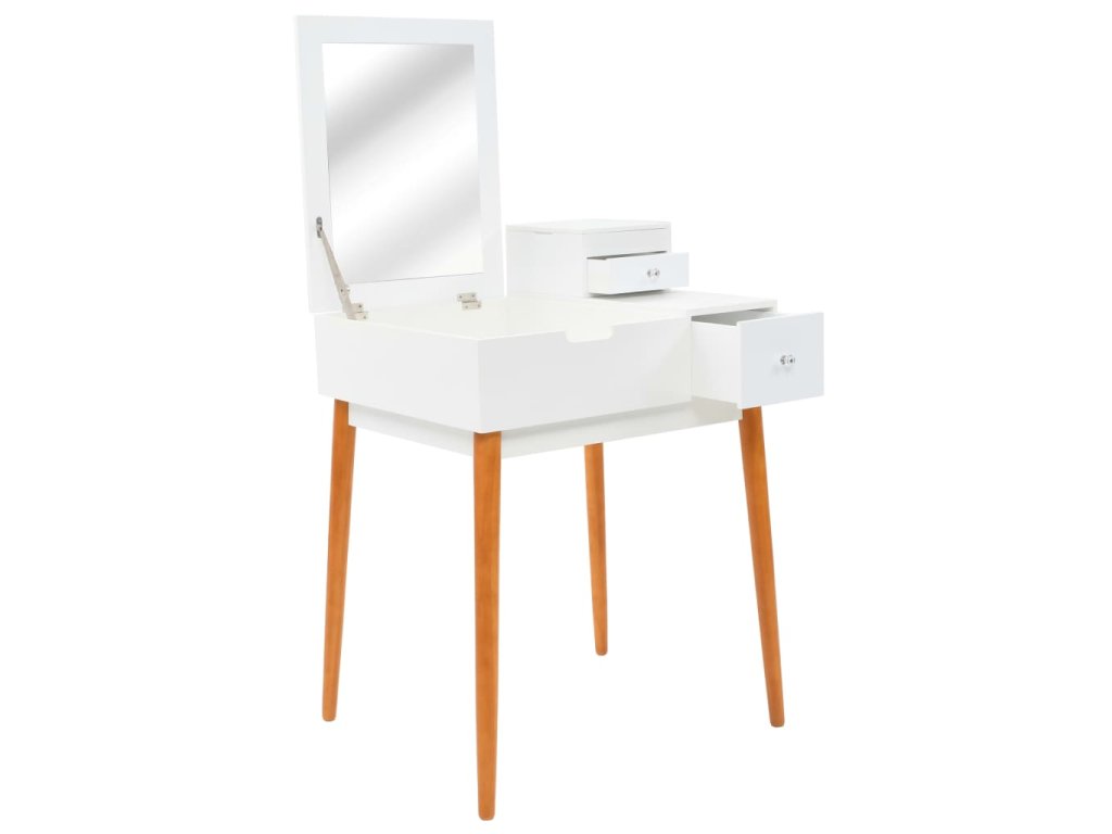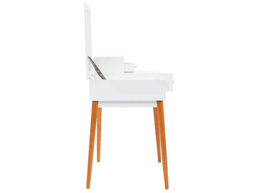 Stolek je vyroben z MDF a je vybaven skleněným zrcadlem. Levý panel je možné zvednout, čímž odkryjete zrcadlo a prostorné přihrádky na šperky. Poskytne vám spoustu prostoru pro vaši kosmetiku, vlasové produkty a přípravky pro péči o pleť. Pokud zrcátko právě nepoužíváte, stolní deska lze výborně využít k odkládání nejrůznějších líčidel, šperků a kosmetických potřeb. Pevné dřevěné nohy zajišťují stabilitu stolku a zároveň přispívají k jeho modernímu stylu z poloviny století.