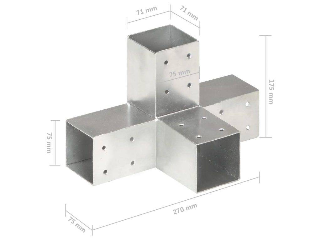 Elektrogalvanizovaná spojka umožňuje snadné připojení a spojení trámů nebo nosníků. Všechny spojky jsou předvrtané. Tato trámová spojka je určená pro 4 čtvercové dřevěné trámy s hranou o délce 71 mm.