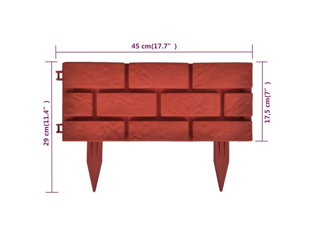 Každý propojitelný kus plotu má dva hroty, které se snadno zapíchnou do země. Celková délka trávníkového lemu je 5 metrů. Každý kus má na délku 45 cm a na výšku 17,5 cm (bez hrotu). Travní lem je vyroben z vysoce kvalitního polypropylenu, takže vám bude sloužit po mnoho let.