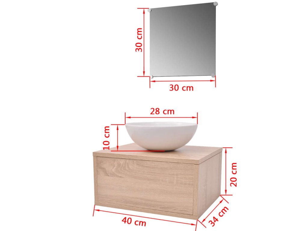 Sada nábytku sestává ze zrcadla a skříňky pod umyvadlo. Kompaktní velikost a minimalistický design z ní dělají skvělý doplněk do každé moderní koupelny. Koupelnová skříňka, vyrobená z vysoce kvalitní dřevotřísky, je velmi robustní a odolná.