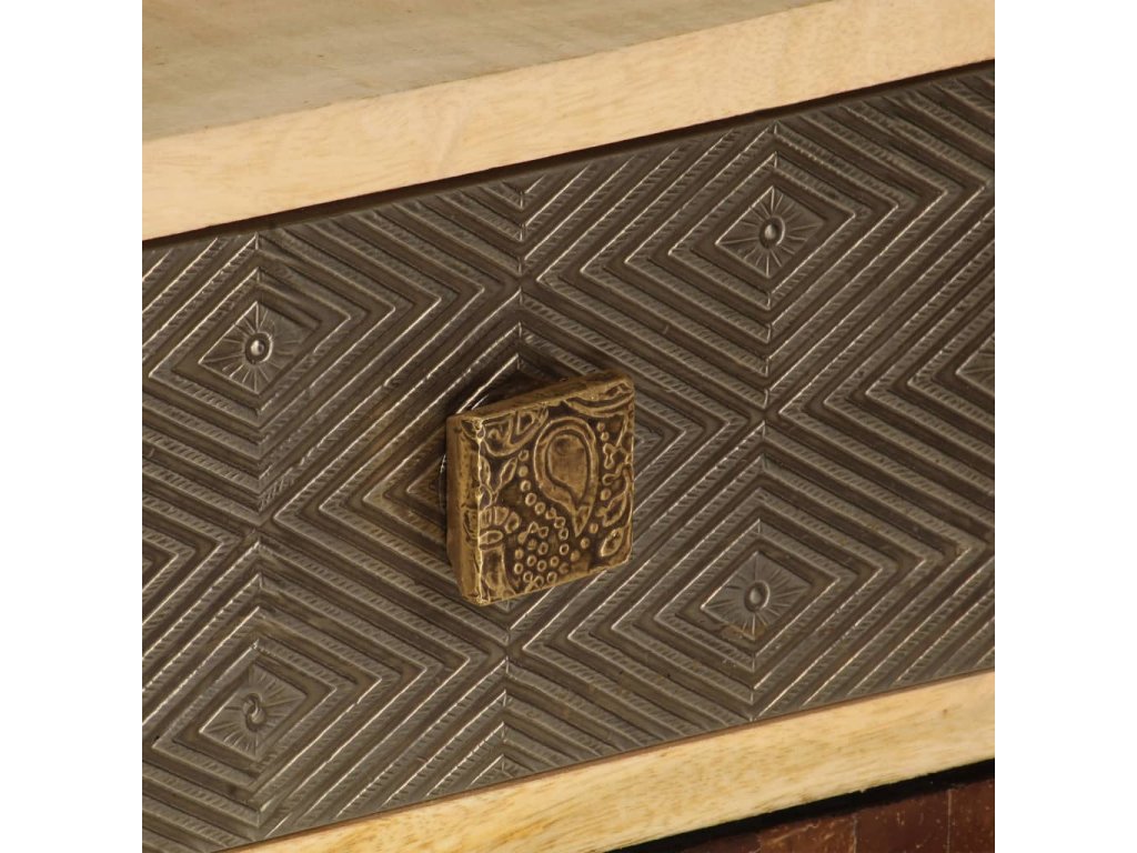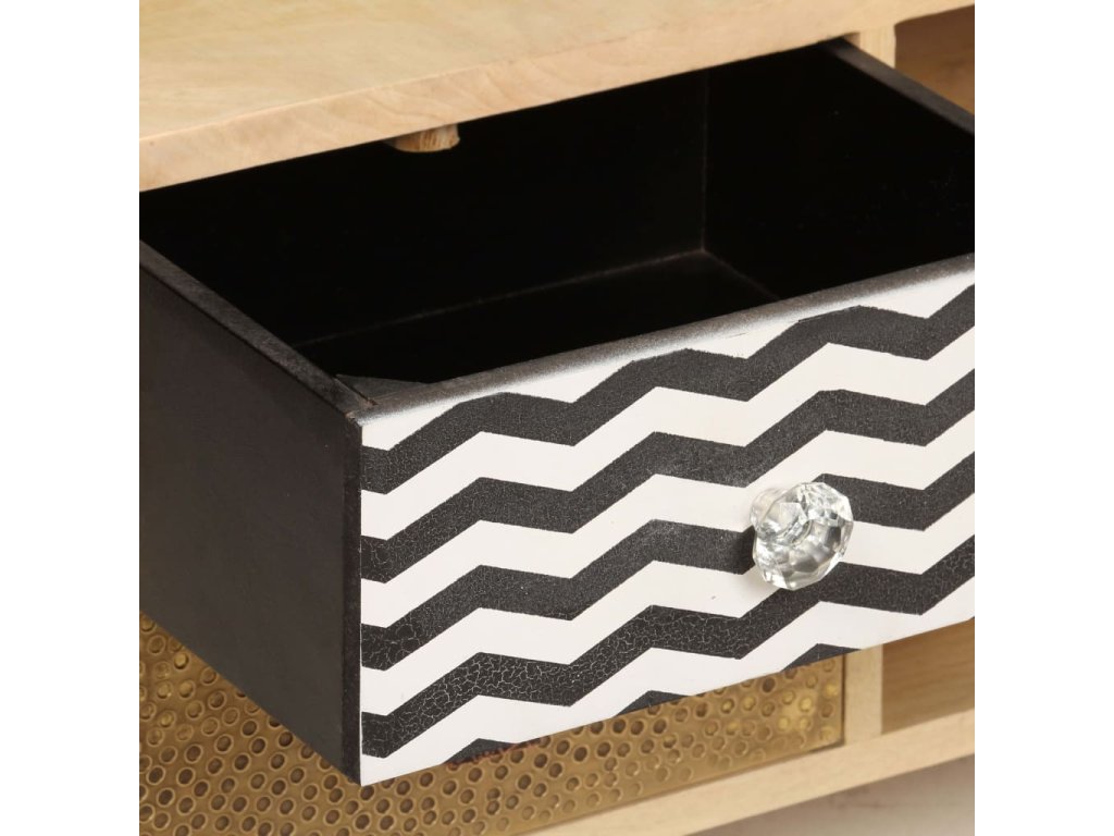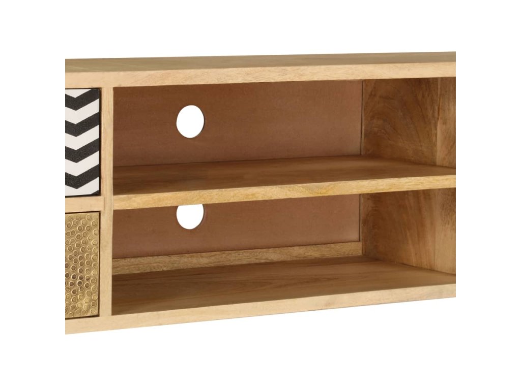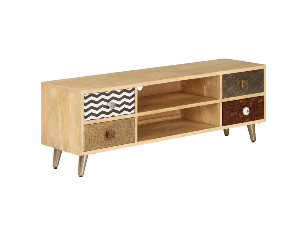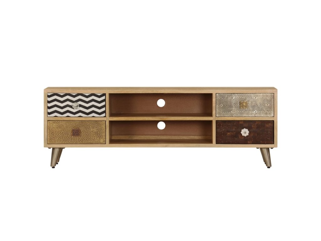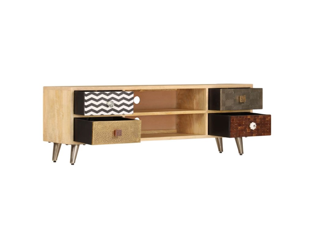 Stolek pod TV je vyrobený z masivního mangovníkového dřeva, které je nejen stabilní a odolné, ale zároveň také krásně vypadá. Zručné zpracování podtrhuje jeho okázalý retro styl. Každá fáze výrobního procesu je prováděna s mimořádnou péčí, ať už se jedná o leštění, natírání anebo lakování. Překrásná textura a kresba dřeva spolu s řemeslnou výrobou činí každý kus nábytku jedinečným a lehce odlišným od ostatních. Kovové nohy zajišťují vynikající stabilitu TV stolku. Televizní skříňka disponuje 2 přihrádkami a 4 zásuvkami, které vám poskytnou úložného prostoru pro přehledné uložení vašich DVD přehrávačů, herních konzolí, satelitních zařízení a mediálních nosičů.