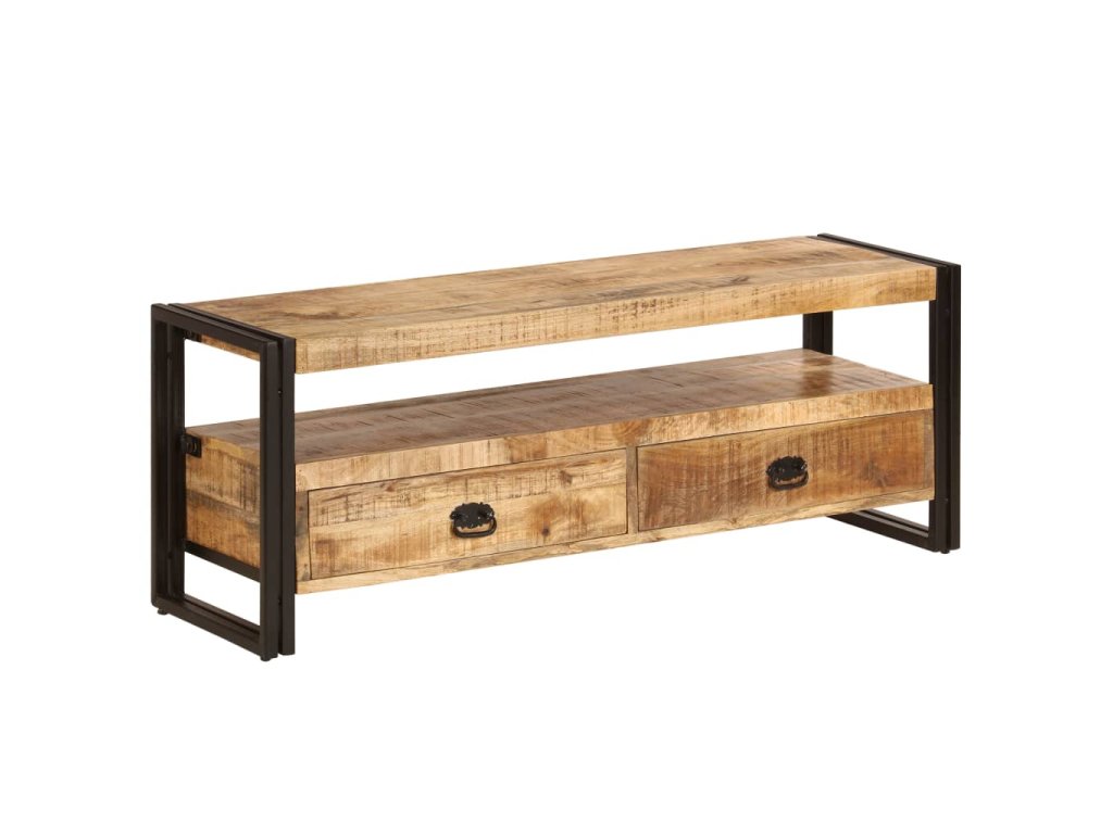 TV stolek ve vintage stylu je vyrobený z masivního mangovníku, je tudíž stabilní a odolný. Mangovníkové dřevo je husté a robustní tvrdé dřevo, jež se na povrchu vyznačuje překrásnou hnědou či zlatavou kresbou. Každá fáze výrobního procesu je prováděna s mimořádnou péčí, ať už se jedná o leštění, natírání anebo lakování. Zesílený ocelový rám zajišťuje výtečnou pevnost stolku. Televizní skříňka disponuje dvěma zásuvkami, kam si můžete uložit nejrůznější drobnosti, a poličkou na vaše multimediální zařízení, herní konzole a časopisy. TV stolek vám rovněž poslouží jako úložná skříňka, Hi-Fi skříňka apod.