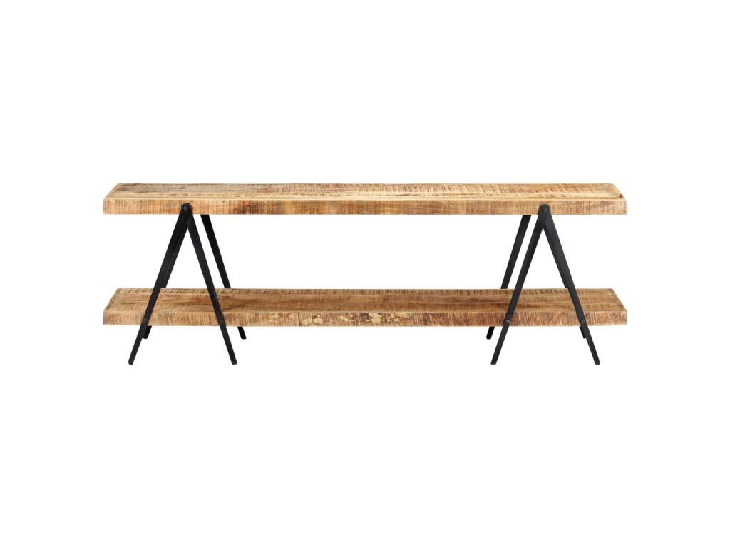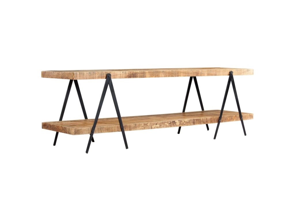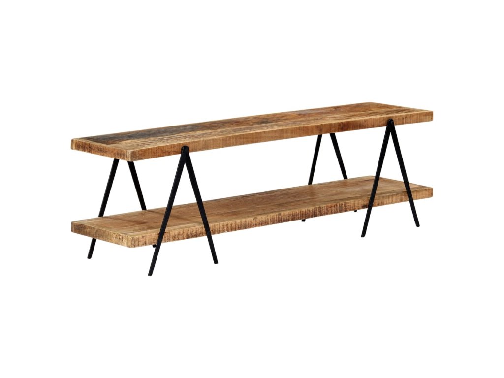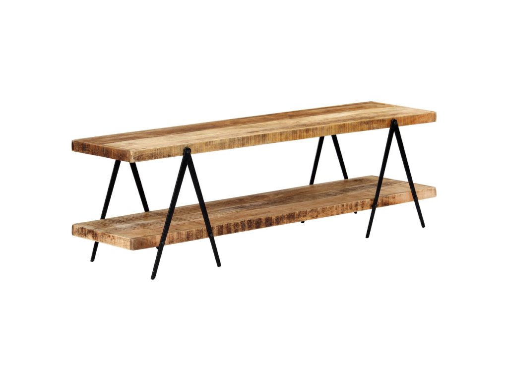 TV stolek je vyroben z masivního mangovníku, tvrdého dřeva s hustou texturou. Hrubé mangovníkové dřevo je nejen schopné unést značnou váhu, ale výborně také odolává opotřebení a působení času. Odkládací skříňka s překrásným designem je proto stabilní, odolná a příjemná na pohled. Precizní řemeslné zpracování a unikátní kresba dřeva dávají vzniknout jedinečným kusům nábytku, které se lehce liší od všech ostatních. Každé fázi výrobního procesu byla věnována mimořádná péče, ať už se jedná o leštění anebo lakování. Televizní stolek má 2 prostorné police, kam si můžete uložit svá multimediální zařízení, knížky a všelijaké další věci. Rám s práškovým lakováním přispívá k pevnosti konstrukce a zdůrazňuje také industriální šarm nábytku. Sestavení tohoto produktu je snadné.