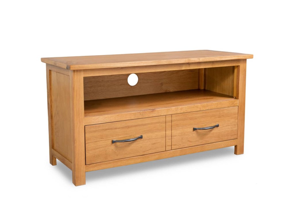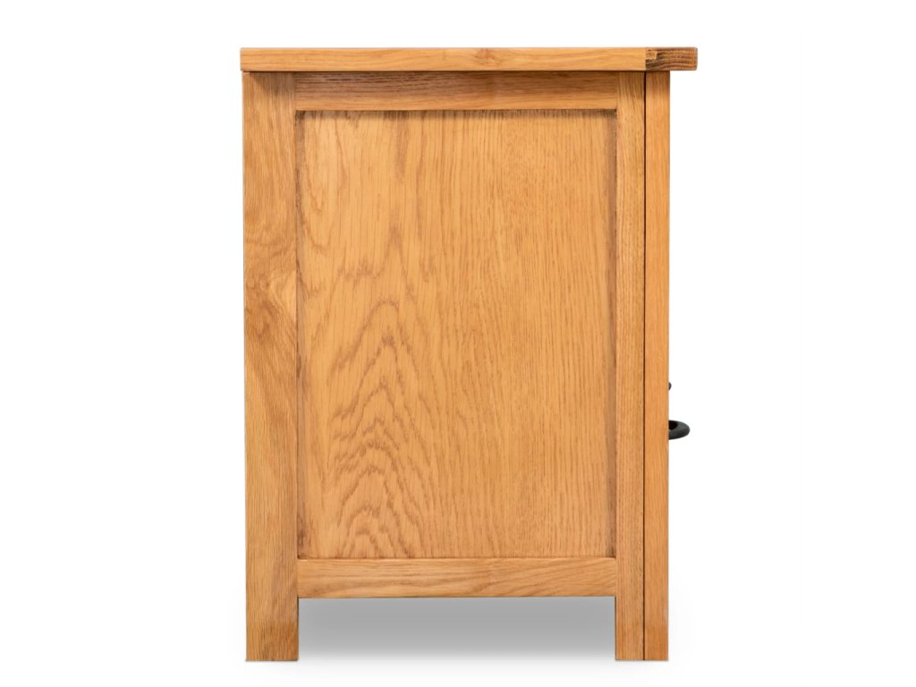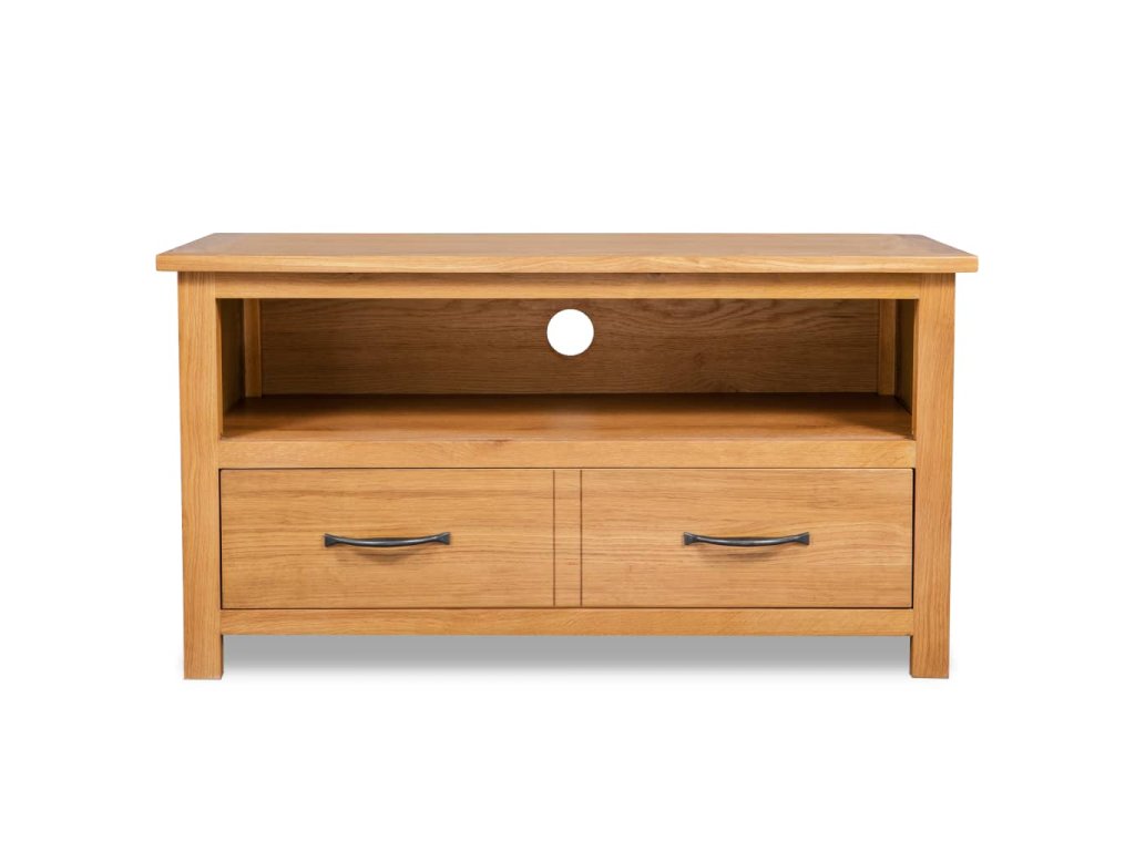 Náš televizní stolek je zhotovený z dubového dřeva, díky čemuž je masivní a robustní. Na jeho pevnou,stabilní desku můžete bezpečně umístit televizi, mísu s ovocem, vázu nebo další dekorativní předměty. Stolek má dvě skříňky a dvě otevřené přihrádky, kam si můžete uložit multimediální příslušenství, knihy a mnoho dalšího.