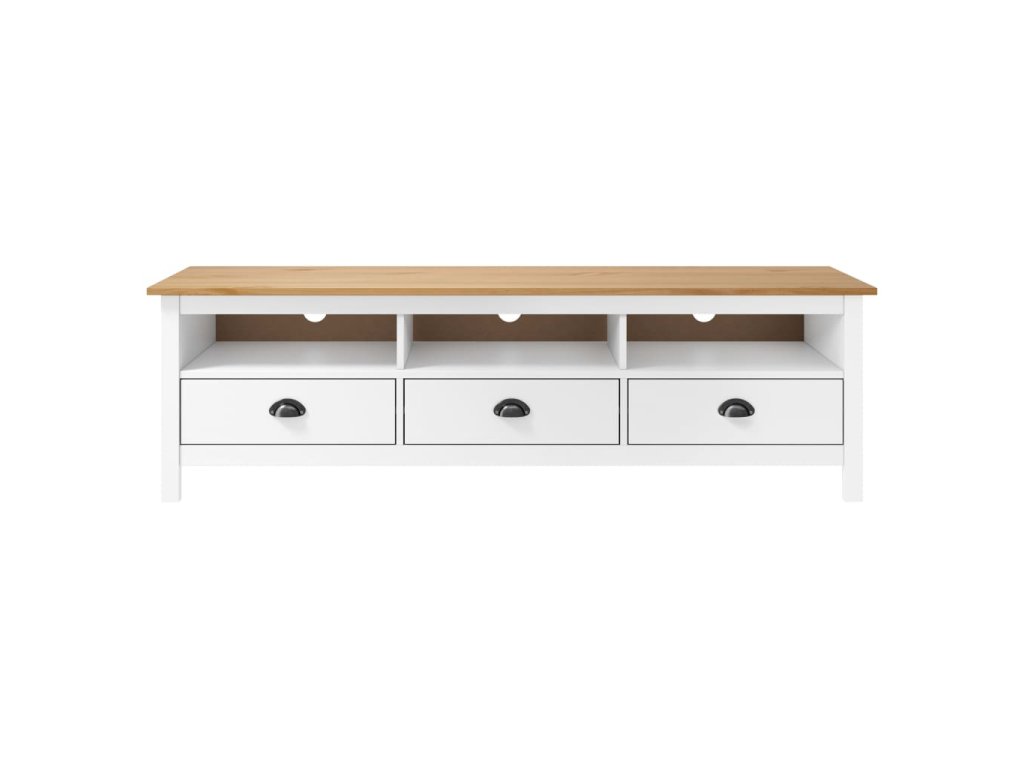Tento TV stolek je zhotovený z masivního borového dřeva, je tedy pevný a odolný. Jeho elegantní design učiní z nízké skříňky uživatelsky přívětivý a mimořádně dekorativní doplněk vašeho domova. Stereo skříňka je vybavena 3 policemi a 3 zásuvkami, poskytne vám tedy spoustu místa pro přehledné uložení různých menších věcí, jako jsou klíče, poznámkové bloky, pera a další drobnosti, které tak budete mít pěkně po ruce. Dlouhá horní deska se navíc skvěle hodí pro umístění televizoru, routeru, multimediálních spotřebičů nebo pro vystavení dekorativních předmětů.