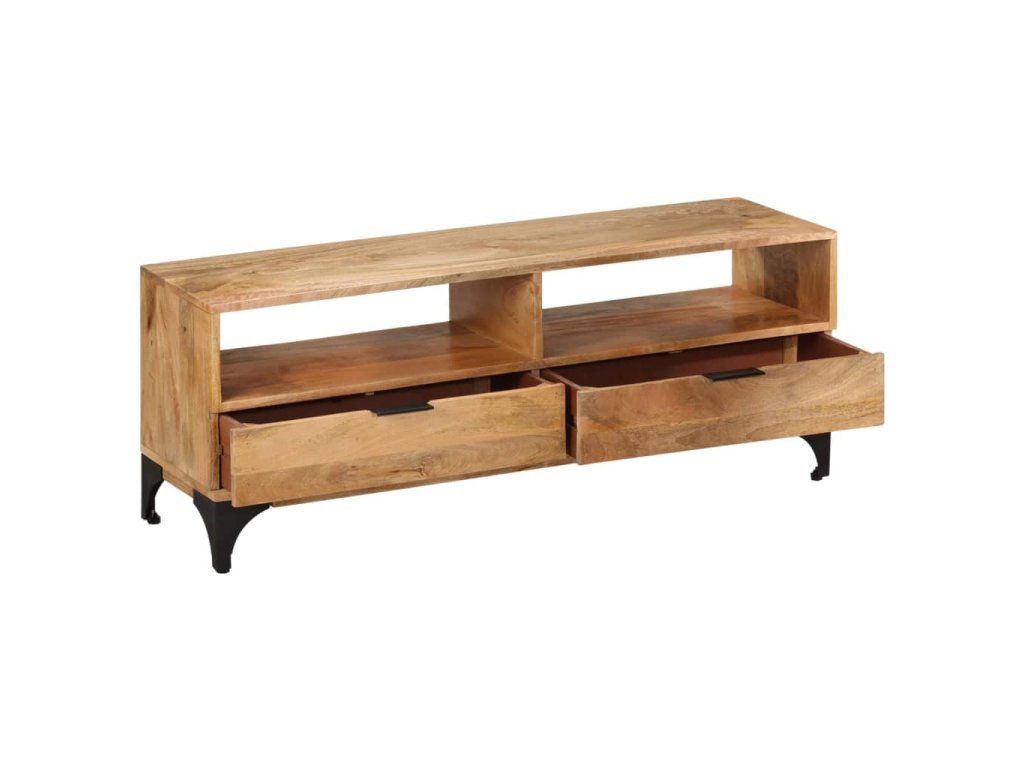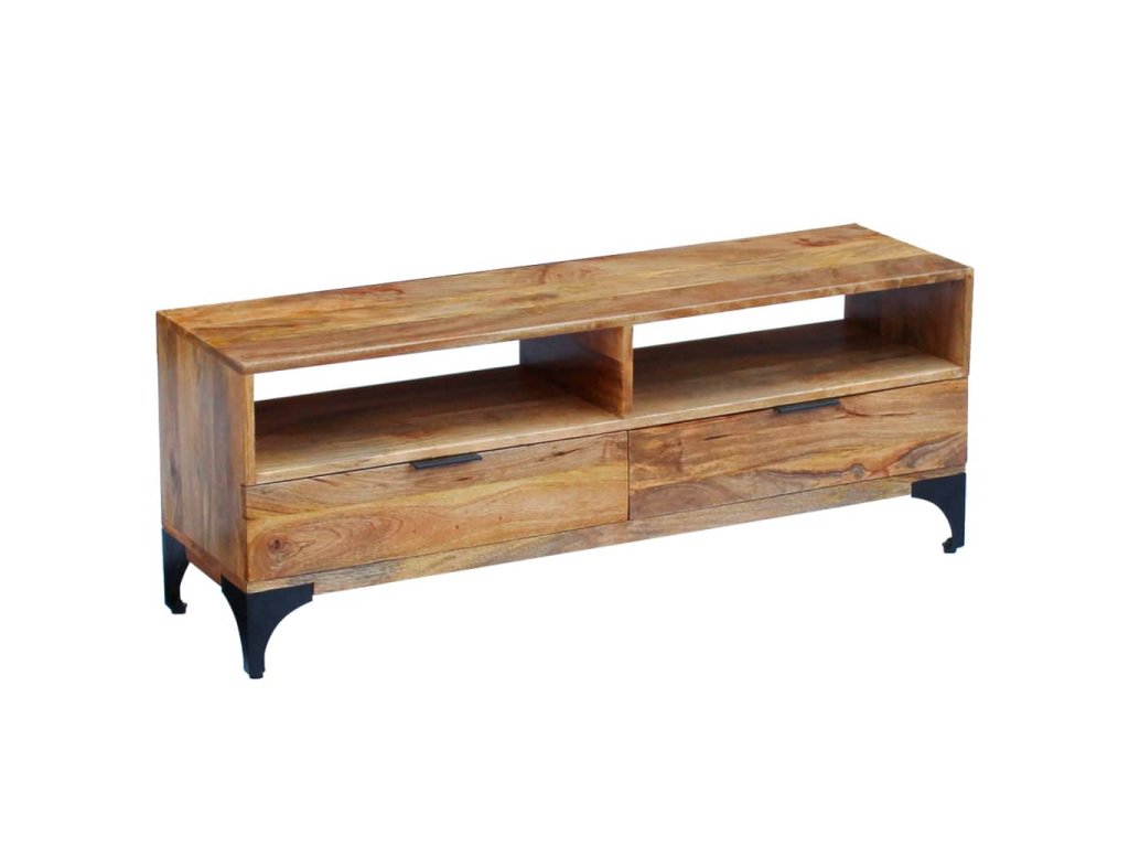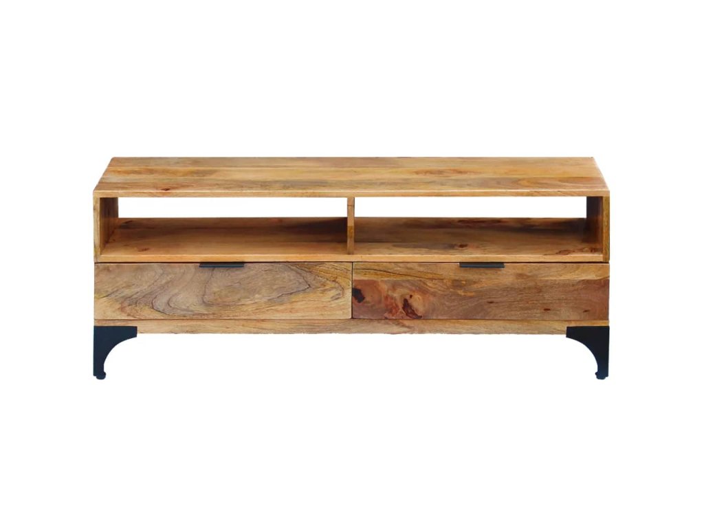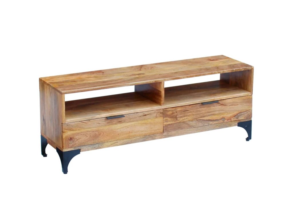 Tento TV stolek bude jedinečným doplňkem do vašeho pokoje. Díky své konstrukci z masivního dřeva je stabilní a bezpečný pro odkládání nápojů, košíků s ovocem nebo dekorativních předmětů. Své věci můžete mít uspořádané a uklizené v jeho dvou přihrádkách a dvou spodních zásuvkách.
