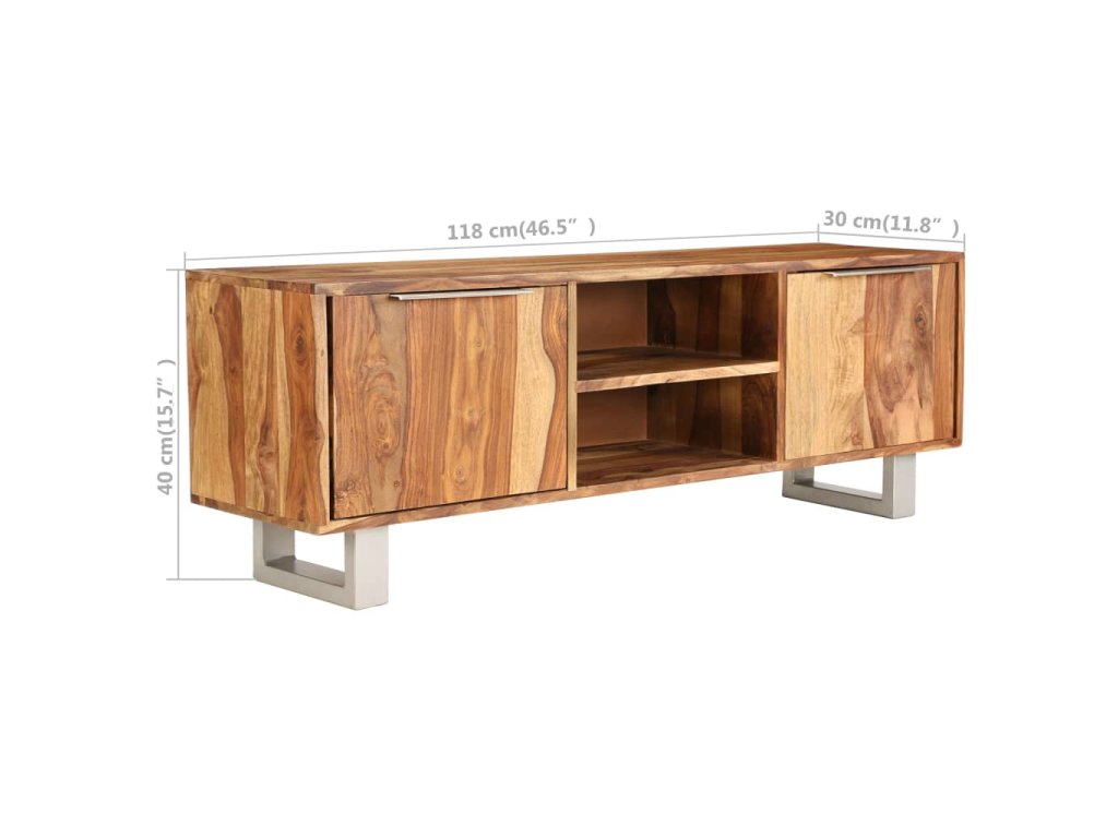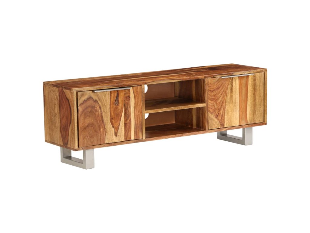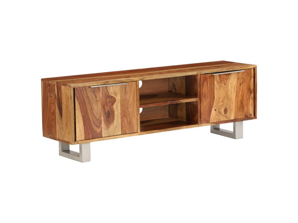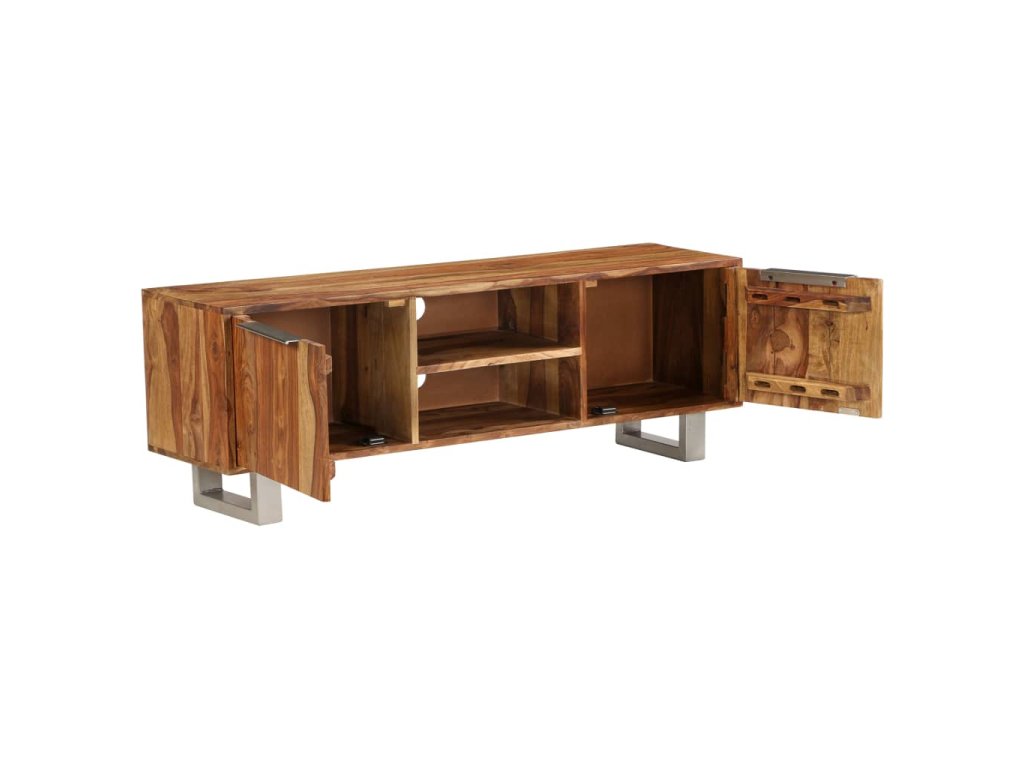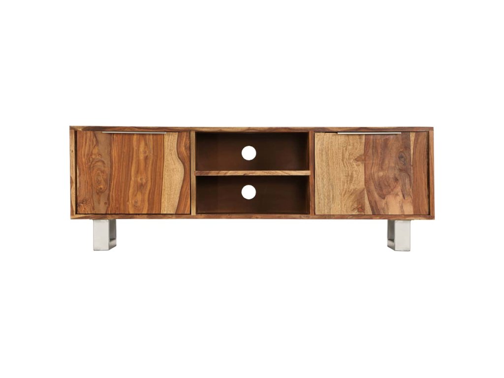 Tento TV stolek je vyroben z masivního akáciového dřeva a můžete jej rovněž použít jako příborník či skříňku na televizi. Akácie je tropické tvrdé dřevo, známé také jako rosewood nebo palisandr, které je proslulé svou bohatou texturou. Každá fáze výrobního procesu je prováděna s největší pečlivostí, ať už se jedná o leštění anebo lakování. Řemeslné zpracování a překrásná kresba dřeva se zasluhují o to, že je každý kus nábytku zcela jedinečný a lehce odlišný od ostatních. Stolek disponuje pevnou deskou, na níž si můžete vystavit dekorativní předměty, jako jsou košíky s ovocem nebo vázy. Je vybaven 2 přihrádkami a 2 skříňkami, jež vám poskytnou spoustu prostoru na uložení vašich DVD, multimediálních zařízení a dalších malých předmětů, které si můžete přehledně uspořádat a mít je po ruce. V zadní části se nachází 2 otvory na vyvedení kabelů. Ocelové nohy dodávají stolku stabilitu a zvýrazňují jeho design ve stylu poloviny minulého století. Montáž je snadná.