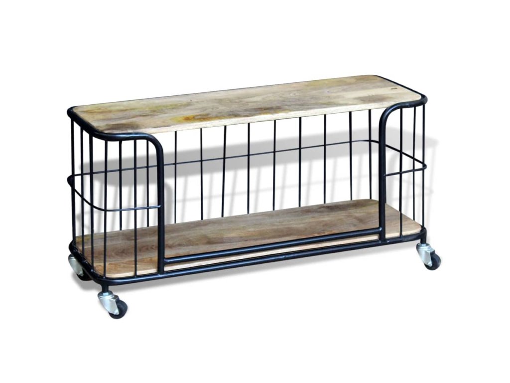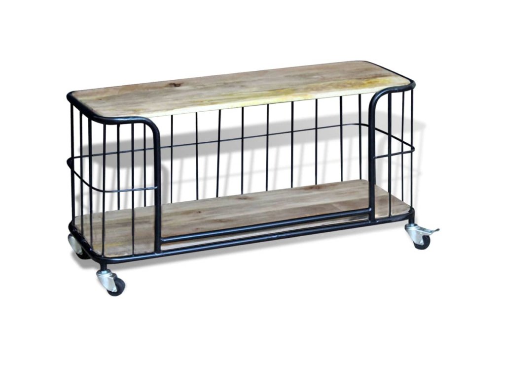 Tento TV stolek je vyroben z masivního mangovníkového dřeva, což znamená, že každý kus nábytku je robustní, stabilní a odolný. Police ve spodní části poskytuje prostor na uložení vašich multimediálních zařízení, časopisů apod. Železný rám zvyšuje jeho robustnost a design ve stylu pekárny dodává stolku skutečně ohromující a jedinečný vzhled. Díky svým 4 kolečkům se tento TV stolek dá flexibilně umístit a snadno přesouvat z místa na místo. Viditelná struktura dřeva dělá z každého stolku unikátní kus, lehce odlišný od všech ostatních.