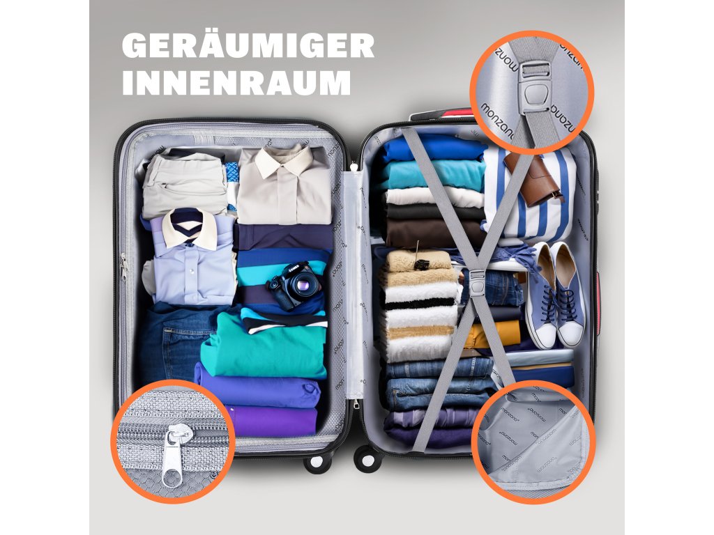 Lehká sada 3 pevných cestovních kufrů z ABS plastu se 360° kolečky, teleskopickými rukojeťmi a bezpečnostními zámky ve stříbrné barvě s praktickým příslušenstvím.