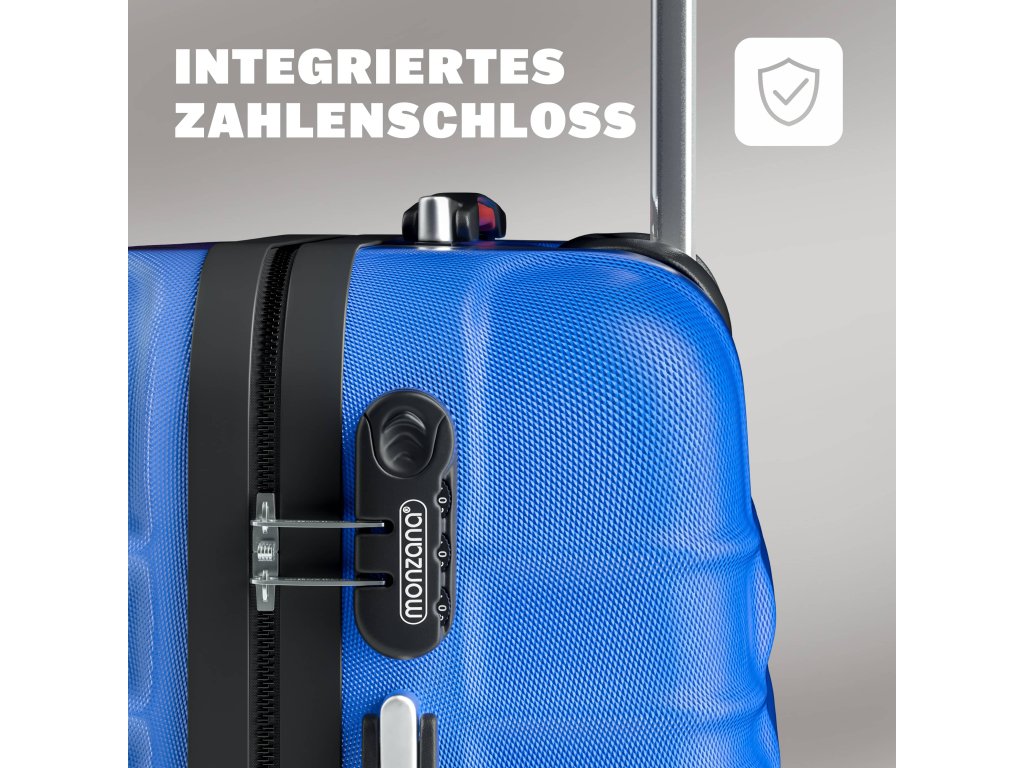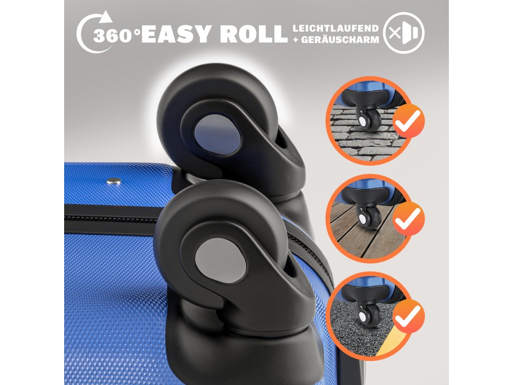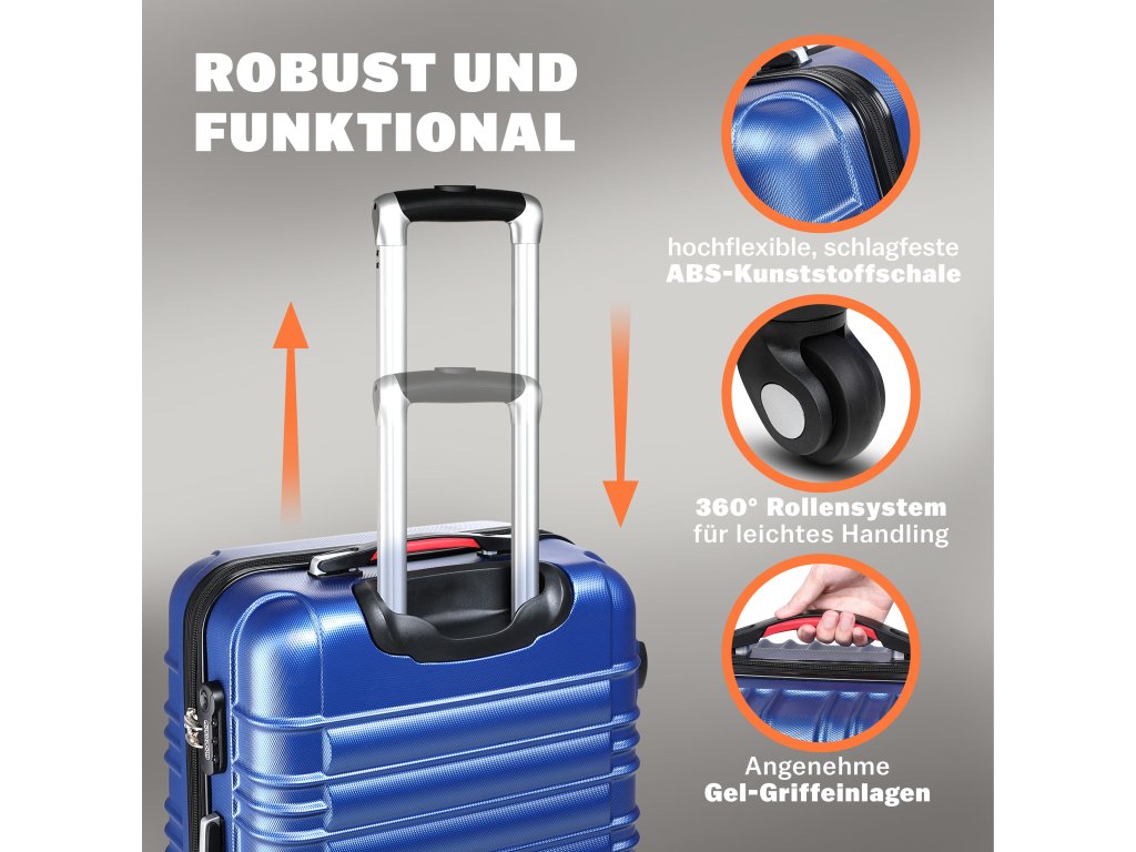 Praktická sada 3 cestovních kufrů z ABS s 360° kolečky, teleskopickými rukojeťmi a bezpečnostními zámky v modré barvě s kufrovou váhou a organizéry.