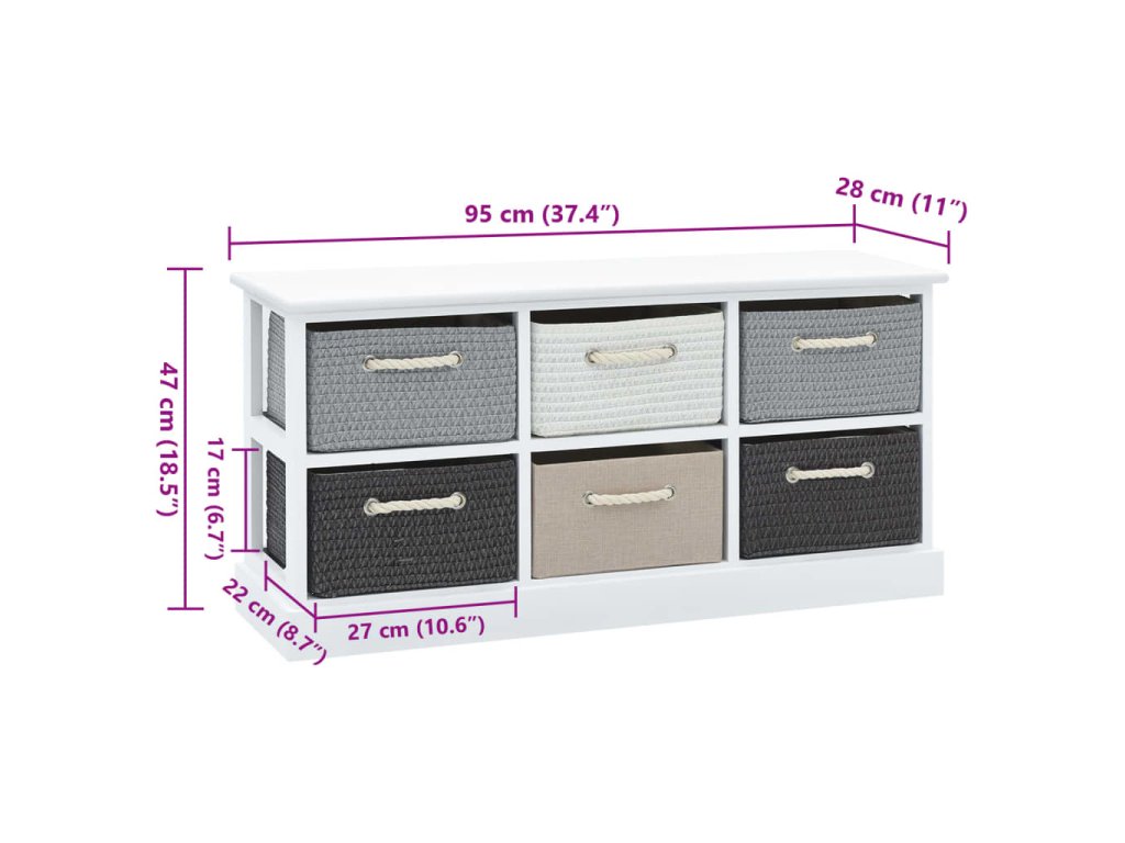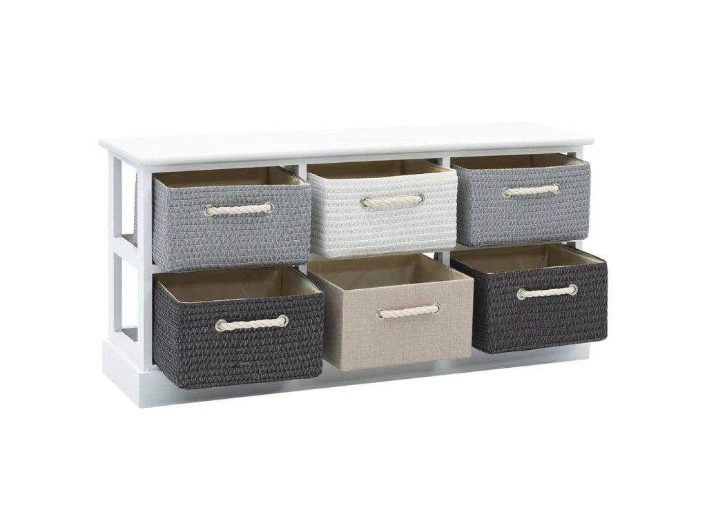 Tato skříňka má 6 zásuvek, které poskytují dost místa na to, abyste měli své drobnosti uklizené, a přitom stále na dosah. Zásuvky jsou opatřené provazovými úchytkami ve venkovském stylu. Zásuvky se dají mezi sebou vyměňovat.