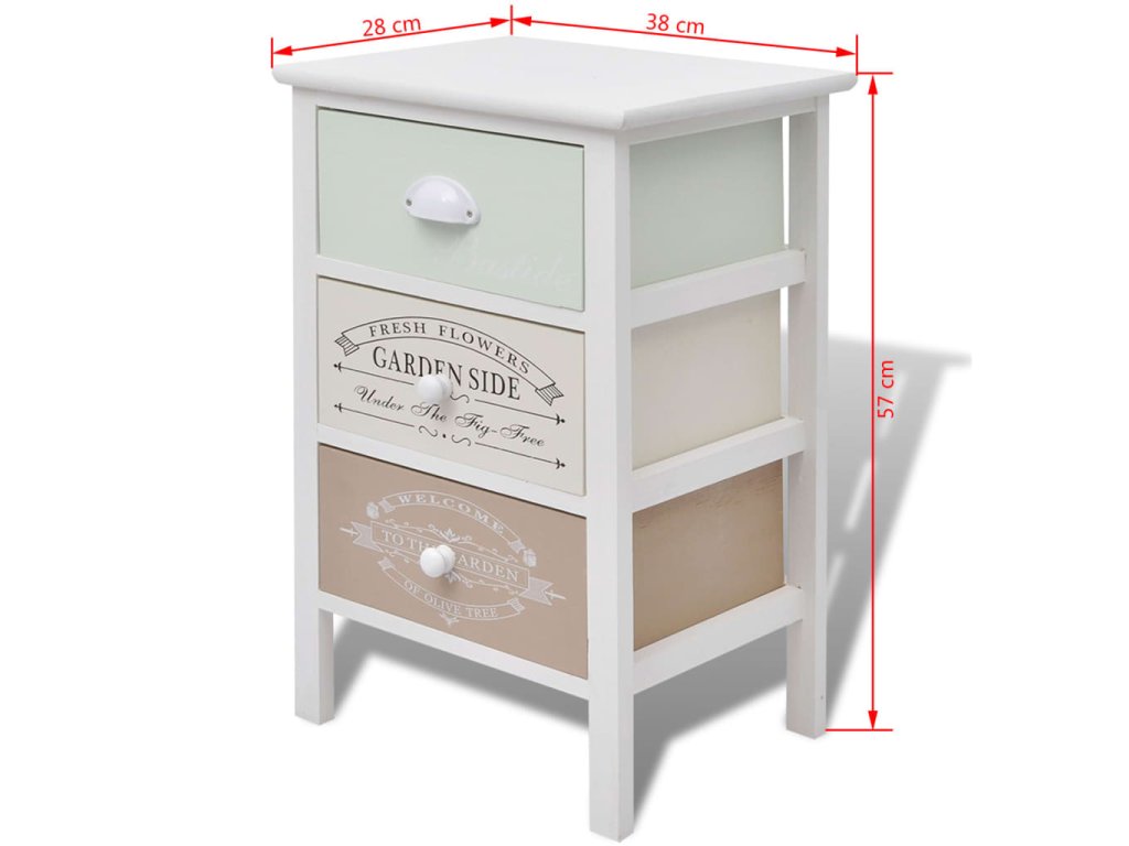 Tato skříňka má 3 zásuvky s hladkým otevíráním, které poskytují dostatek úložného prostoru pro vaše osobní věci a pomohou udržet v pokoji pořádek. Zásuvky s potiskem ve vintage venkovském stylu dodávají skříňce rustikální půvab. Zásuvky se dají mezi sebou vyměňovat. Na horní desce této skříňky do předsíně můžete také vystavovat různé předměty, jako jsou fotografie, knihy a pokojové rostliny. Jelikož je tato odkládací skříňka vyrobena z vysoce kvalitních materiálů, je odolná a snadno se čistí.