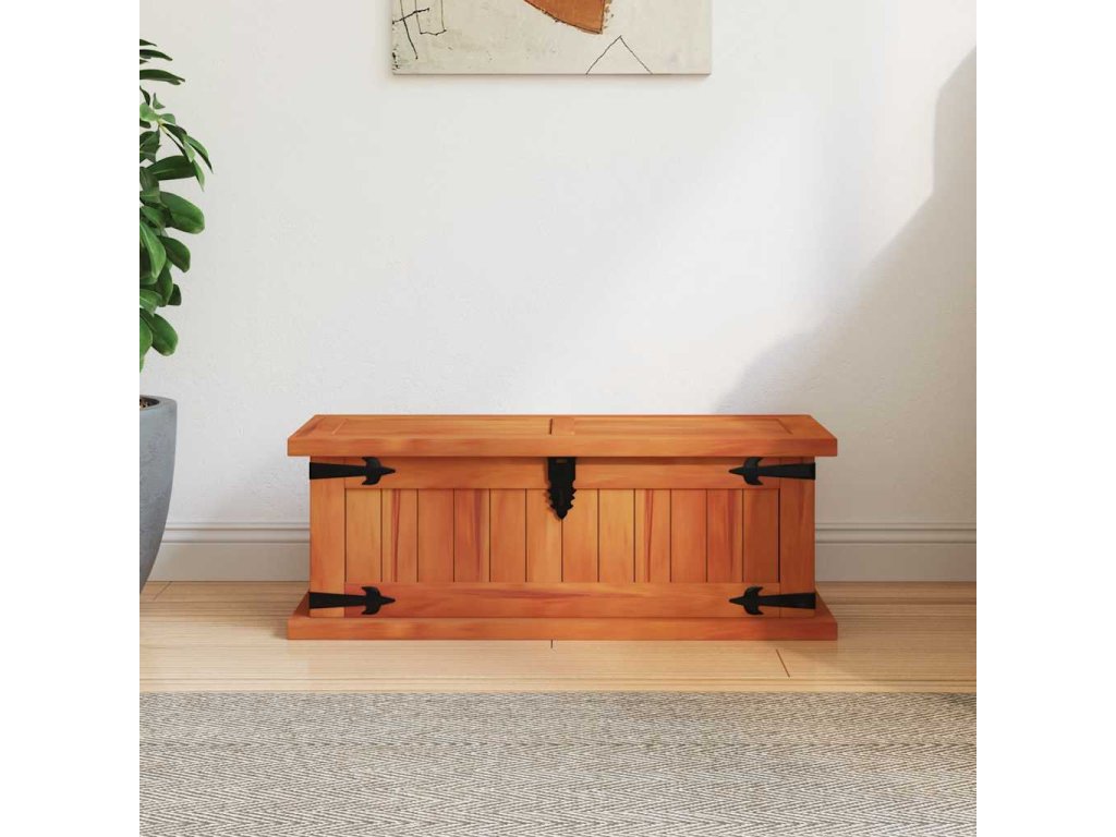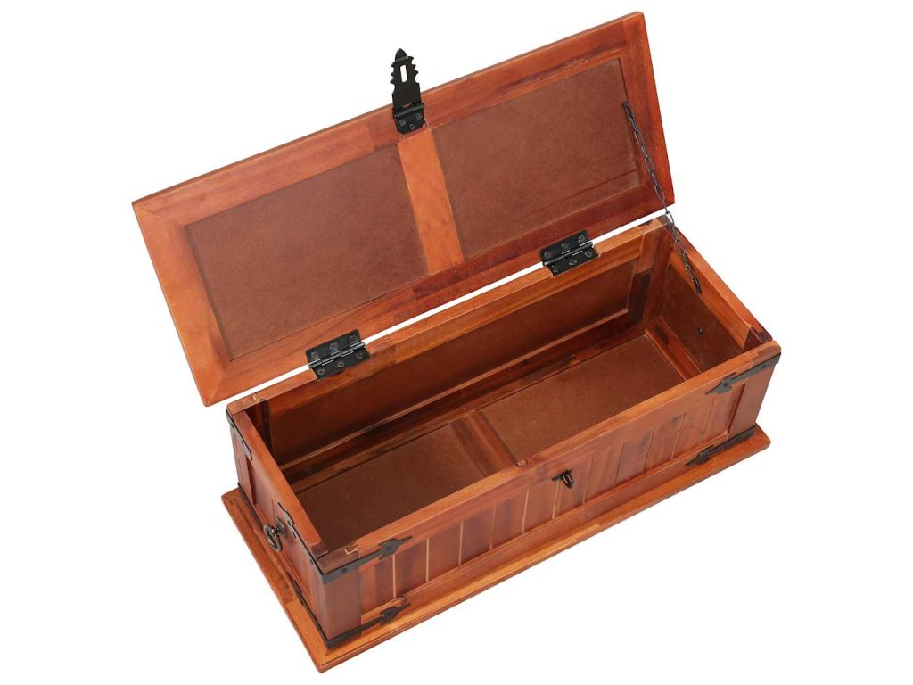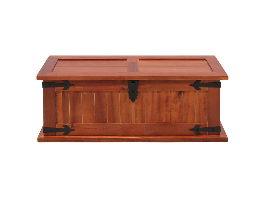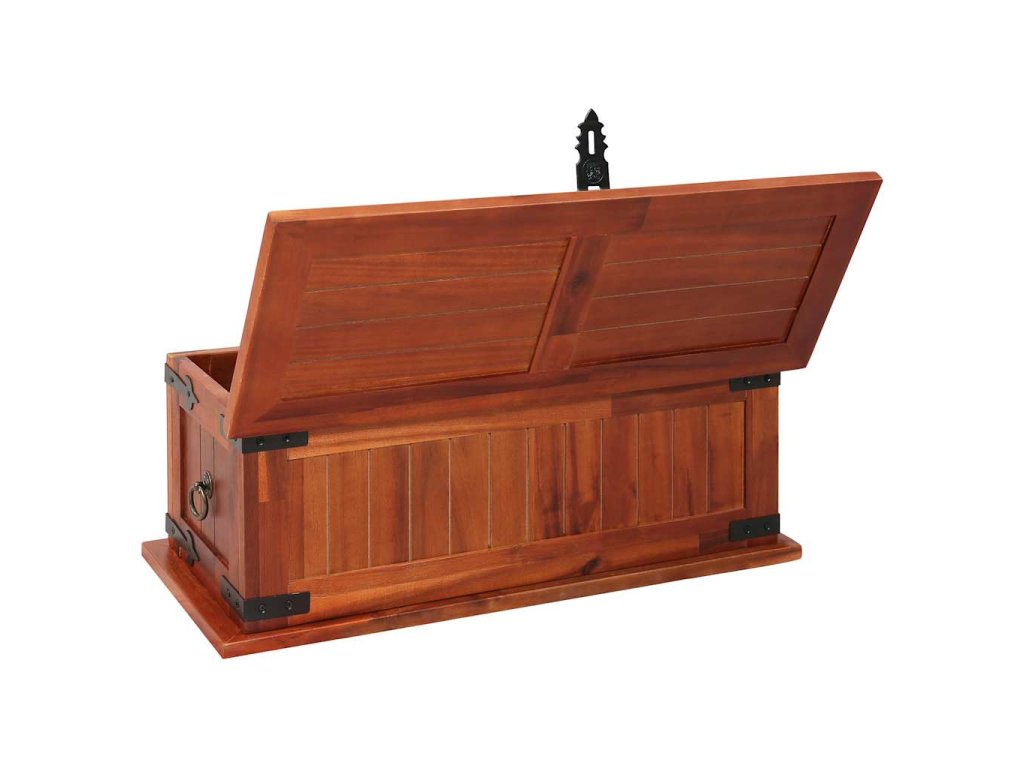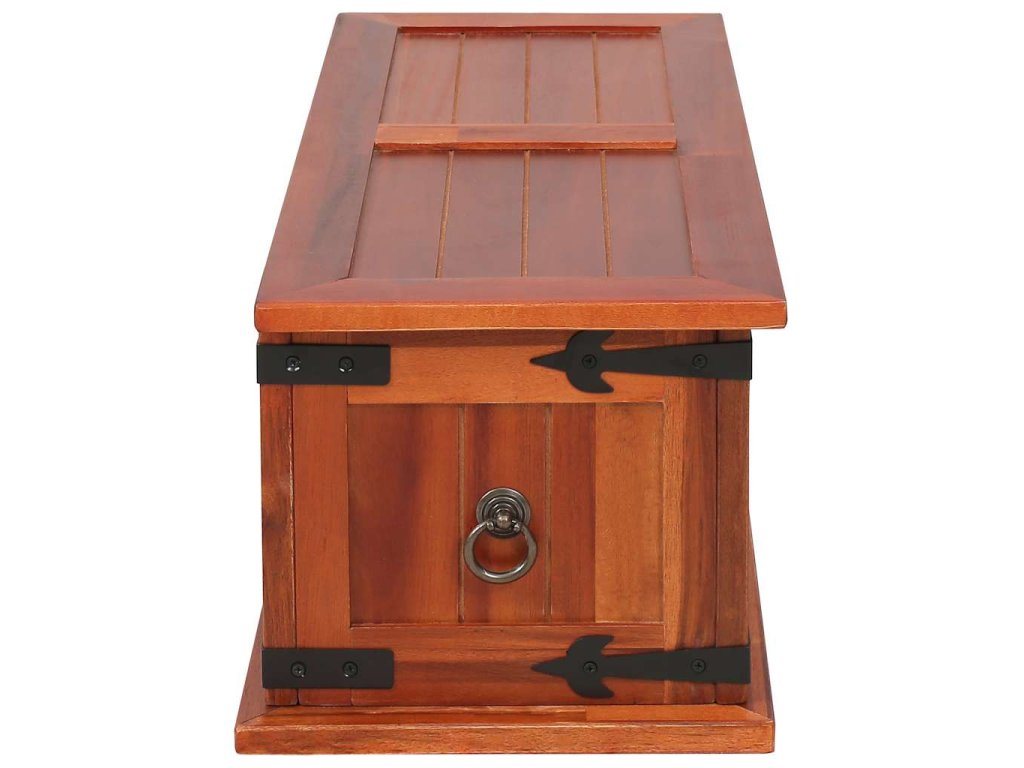 Úložný box vám poskytne spoustu místa, kam si můžete uložit své oblečení, časopisy, knížky, nářadí a další věci. Na přední straně má západku, zatímco boční strany jsou opatřeny úchytkami. Horní víko dřevěné truhly tvoří pevná deska, můžete ji tedy rovněž využít jako konferenční stolek, stolek k pohovce, stolek do obývacího pokoje, odkládací stolek, přístavný stolek apod. Box je ručně vyroben z masivního akáciového dřeva. Zručné zpracování a překrásná kresba dřeva navíc činí každý kus nábytku zcela jedinečným a lehce odlišným od ostatních.