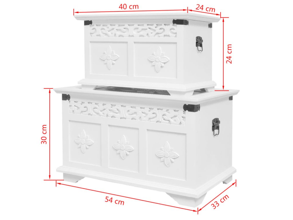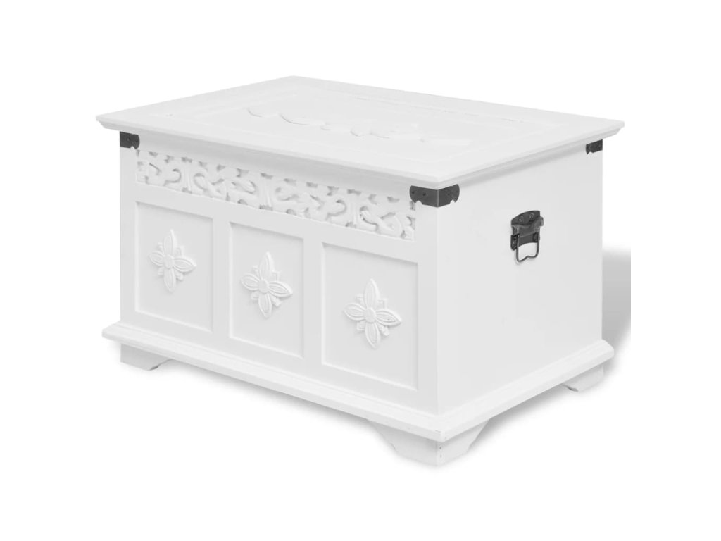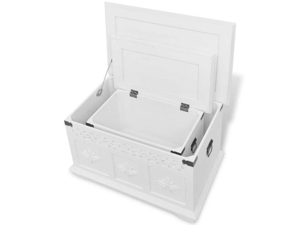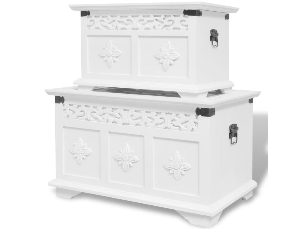 Tyto úložné truhly poskytují dostatek úložného prostoru pro textil, časopisy, knihy, hračky a další doplňky. Box s bílým lakovaným povrchem jsou vyrobeny z robustního MDF a borového dřeva, které zdobí složité ručně vyřezávané detaily. Každá truhla má po obou stranách rukojeti ve starožitném stylu a snadno se přenáší. Díky svému jedinečnému elegantnímu designu mohou být tyto truhly použity také jako konferenční stolky, odkládací stolky apod.