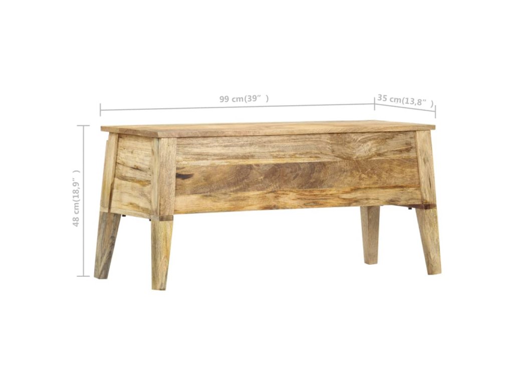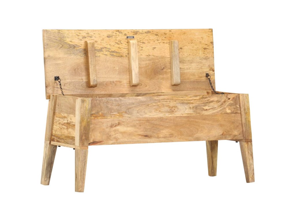 Úložná lavice je vyrobená z masivního mangovníku, tvrdého a tropického dřeva. Má nejen dostatečnou nosnost, ale také výborně odolává opotřebení a působení času. Rozdíly v kresbě a barvě dávají každému kusu nábytku jeho výrazný a od všech ostatních mírně odlišný charakter. Tato lavička do předsíně může také sloužit jako prostorný úložný box pro ukládání vašich multimediálních spotřebičů, knih, obuvi a různých dalších předmětů. Montáž úložného boxu do chodby je snadná.