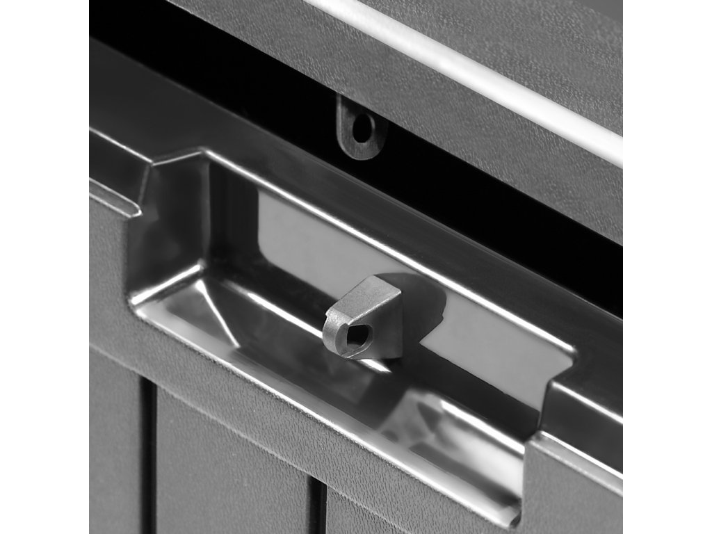 Víko je nosné až do 100 kg, takže box může posloužit i jako sedátko. Integrovaná kolečka a postranní madla usnadňují přesouvání, zatímco zámek ve víku zajistí bezpečné uzavření obsahu (možnost přidání visacího zámku – není součástí balení). Montáž zvládnete bez nářadí díky chytrému systému smart click, který umožní box rychle sestavit.
