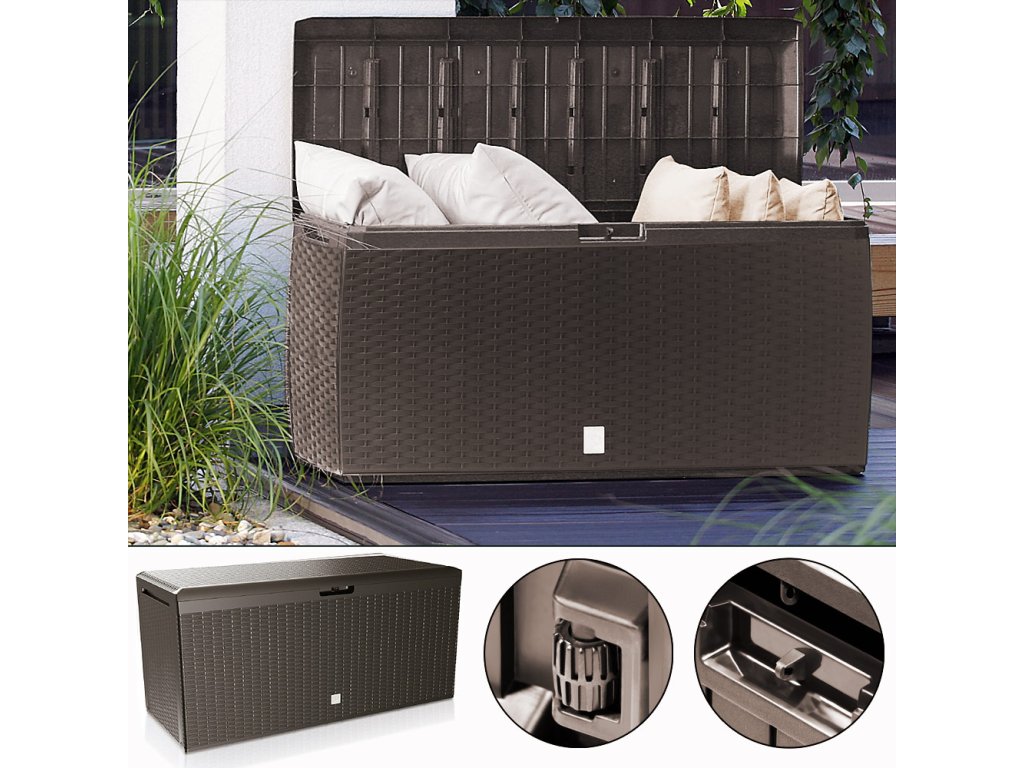 Díky odolnému polypropylenu s UV ochranou odolá box nepřízni počasí i slunečnímu záření. Víko s nosností až 100 kg umožní využití jako lavice, zatímco 6 koleček a boční úchyty usnadní přemístění i plně naložené truhly.